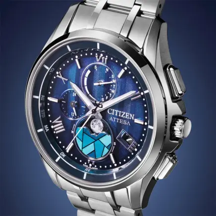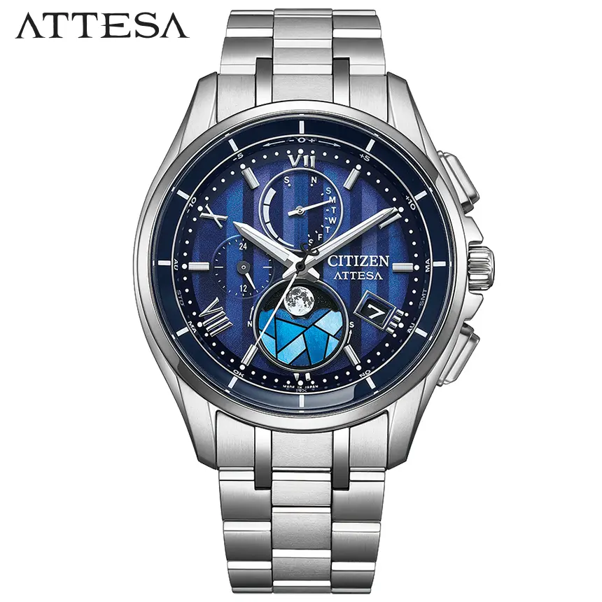 縦のブルーグラデーションで教会に降り注ぐさまざまな光を描いた文字板に、半透明の印刷を施した白蝶貝を使用し、**美しく光るステンドグラス**を表現。まるでステンドグラス越しの夜空を見上げるように、**ムーンフェイズ(月齢)**の満ち欠けを確認できます。