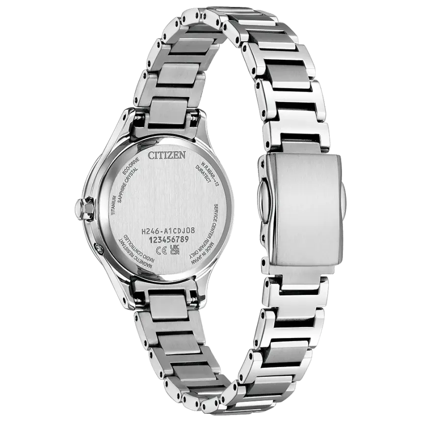 横幅28mm、厚さ8.5mmのコンパクトなケースは、重さ**36g**という軽さを実現。デュラテクトプラチナを施したスーパーチタニウム製で、肌に優しく、日常使いに最適な軽やかさと耐久性を両立しています。