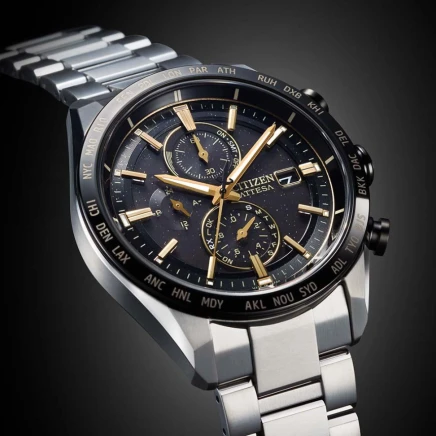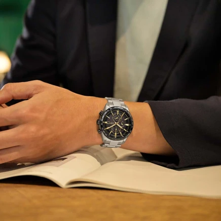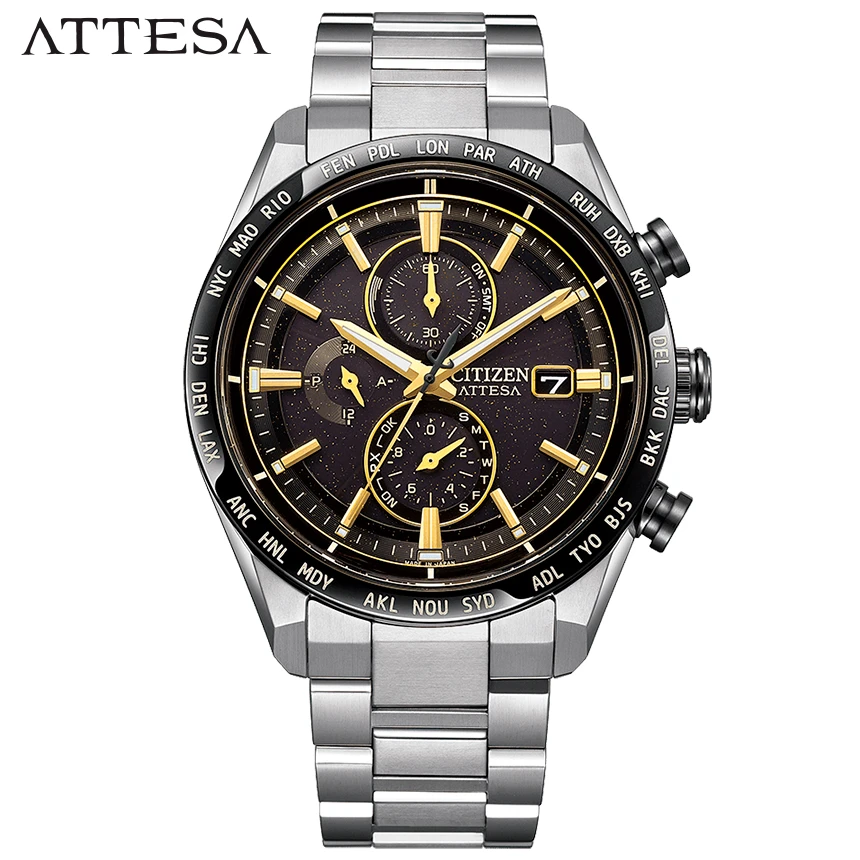 ブラックの文字板をベースに、ゴールドのアクセントカラーを取り入れた華やかな印象のデザインで、新年や新しい門出を祝うにふさわしい配色。