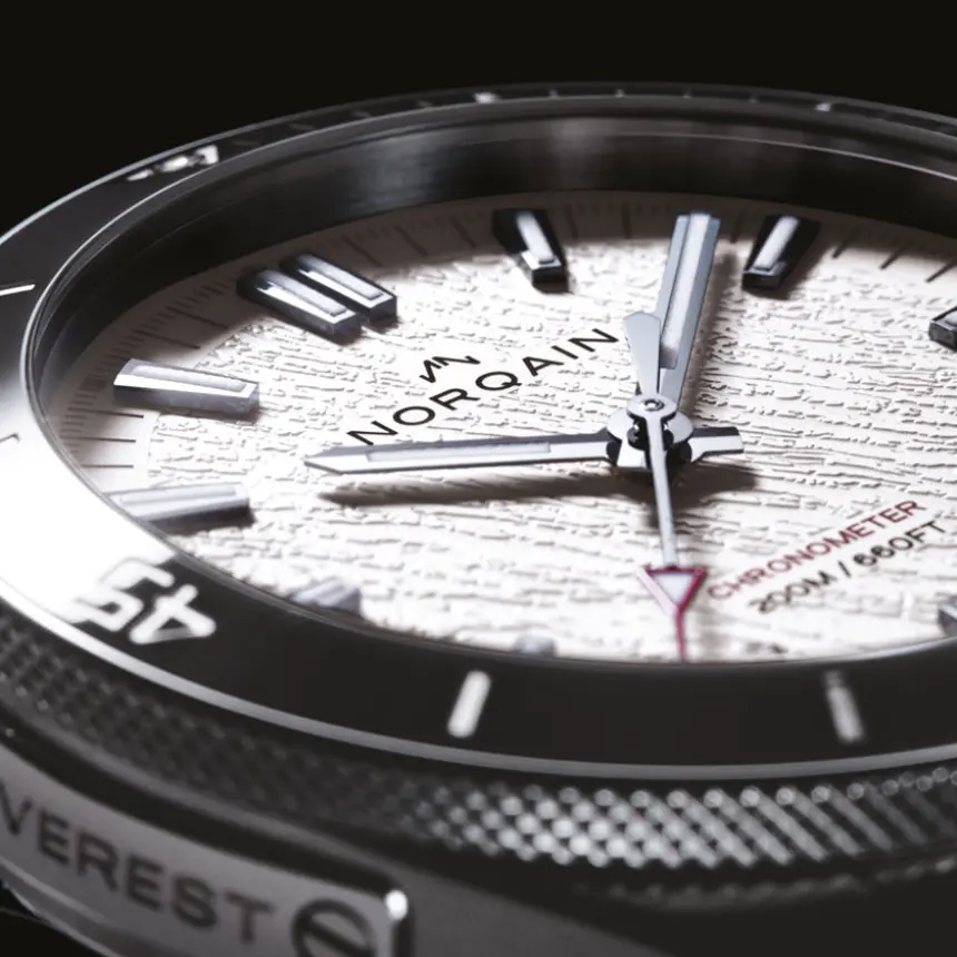 「ネベレスト」は、休むことなく挑戦を続けるノルケインの姿勢そのものです。このグレーシャーモデルの文字盤に刻まれたパターンは、エベレスト登頂の難所「クンブ氷瀑」のクレバスをイメージ。頂きを制した者だけが見ることのできる、圧倒的な感動を表現しています。