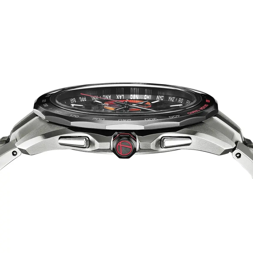 サファイアガラスベゼルのタキメーターには「OKUDA TAMIO」の文字と生誕60周年を祝い「60」の文字を赤色にした特別仕様。9時側のインダイアルリングは、自身の好きな色であるオレンジと赤のグラデーションデザインを採用しています。