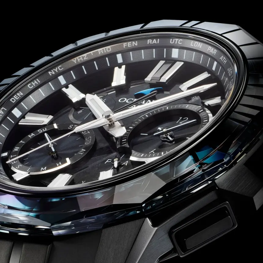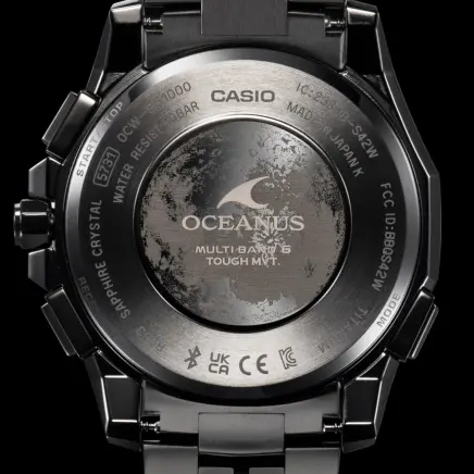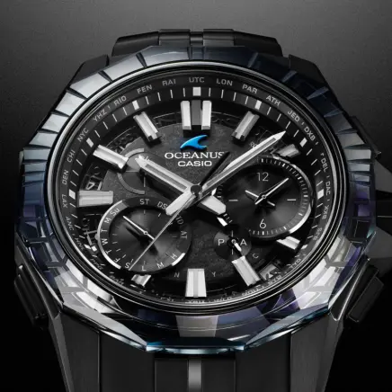 海との親和性を深めながら、どこまでも上質、あくまでも先進を貫くブランド哲学。その成熟と革新が紡ぐオシアナスのストーリーに、特別仕様の限定モデルが加わります。 上質な仕上げと薄く美しいフォルムを追求している「OCEANUS Manta(オシアナス マンタ)」ライン。 OCW-SG1000CNは、オシアナスが誇るものづくりの技術と日本の伝統技法が美しく融合したモデルです。 デザインテーマは、「CALM NIGHT」。 月の光に照らされた静かな海を、オールブラックのチタン外装と江戸切子のサファイアガラスベゼルで表現しました。 千筋とよばれる伝統文様を刻んだベゼルは、江戸切子職人・堀口徹氏自ら意匠を監修。匠の技を駆使した繊細かつ精密なカッティングで、夜空に輝く月明かりとその明かりが彩る海を描きました。透明感のなかに深みと輝きを生み出す色調は、ブラックとシルバーのグラデーション蒸着によるもの。どこまでも続くような広大な海を表現し、見る角度によってブルーに偏光することで、オシアナスらしい表情を醸し出します。 月面をイメージしたダイアルには、型打ちで目付を施した金属素材を使用。発電効率を飛躍的に向上したガリウムタフソーラーの搭載により、文字板装飾の自由度を高めています。 オシアナスが追求するこだわりのものづくりを体現した特別モデル。世界限定600本でお届けします。