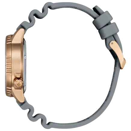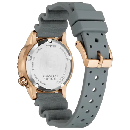 本格仕様のダイバーズウオッチ、プロマスター「MARINEシリーズ」から、清涼感あふれる特別な限定モデルが登場。文字板には、見る角度によって青緑から青紫へと表情を変える「構造色フィルム」を採用し、水深によって色が変化する澄んだ海を表現しました。淡いウォームゴールドのケースにグレーのバンドを組み合わせ、ダイバーズらしいタフさと気品ある佇まいを両立。バンドには環境に配慮したバイオマスウレタン「BENEBiOL™」を採用しています。36.5mmの腕なじみの良いサイズながら、本格的な200m潜水用防水を備えた珠玉の一本です。