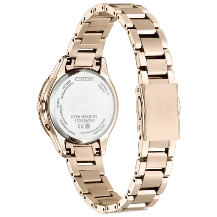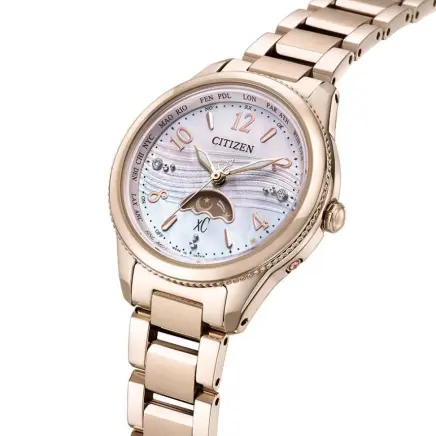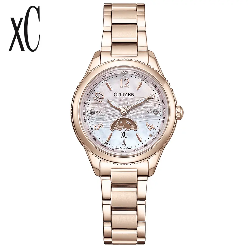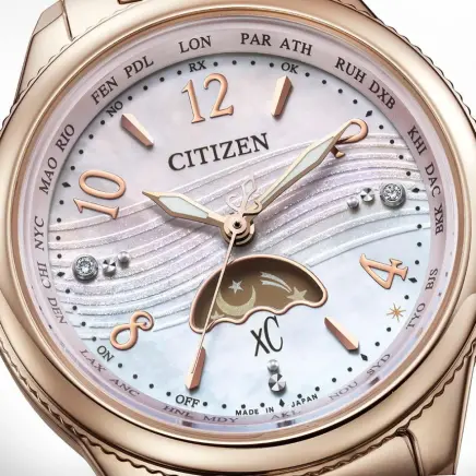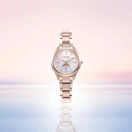 淡く上品なサクラピンク®のケースと、白蝶貝の文字板にブルーグレーからピンクに変化するグラデーションを施した幻想的なカラーリング。エッチングとラメで描いたパターンが、波打ち際のキラキラとした輝きを連想させ、桃色に染まる夕暮れ時の海辺を表現しました。