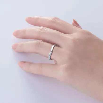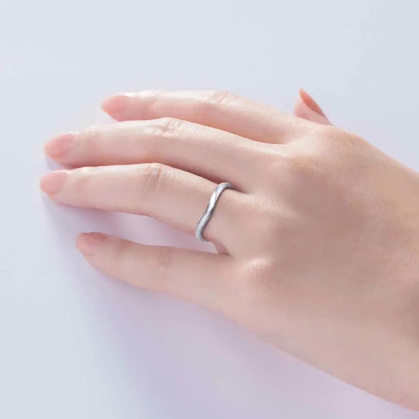 指先をすっきりと美しく魅せるU字ラインのペアモデル。エンゲージリングとの重なりを追求した設計により、セットで着用した際の指馴染みの良さが際立ちます。