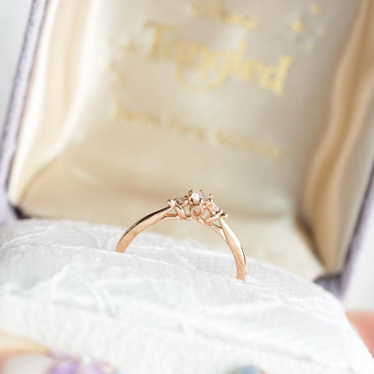高い塔に暮らす少女ラプンツェルは外に出ることが叶わない塔の上でまだ見ぬ自由な世界に憧れを募らせています。エンゲージリング側面にはラプンツェルの夢を叶えるきっかけとなったティアラが隠されています。