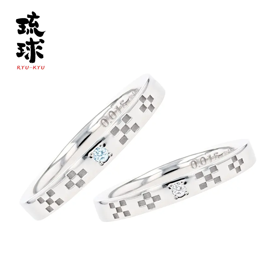 沖縄の方言で海風の意。「うみかじ」は水平線を表現するストレートの平打ちリング。海風が吹き渡る様な爽やかなイメージをアイスブルーダイヤモンドで表現、ホワイトダイヤモンドで打ち寄せる波の白さを表現しています。リング内側を丸く「内甲丸」にして滑らかな着け心地。「琉球」で最もユニークな婚約指輪「うみかじ・チバリヨー沖縄」とのセットでさらに華やかスタイリッシュ。沖縄の青い海の象徴アイスブルーダイヤモンドが、おふたりの新たな船出を見守ります。