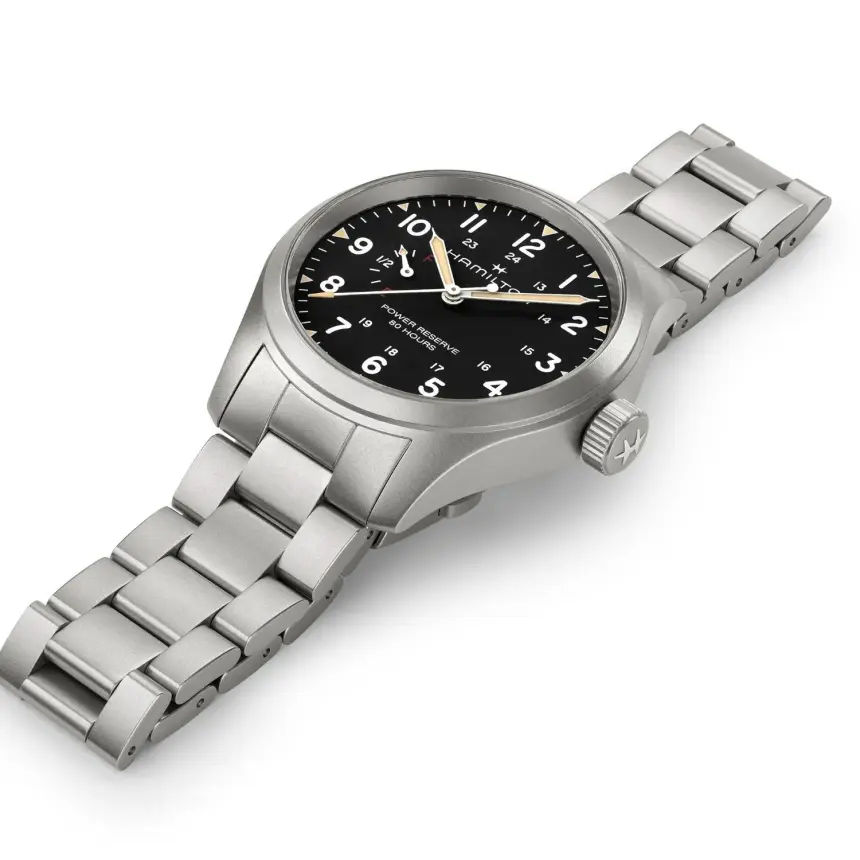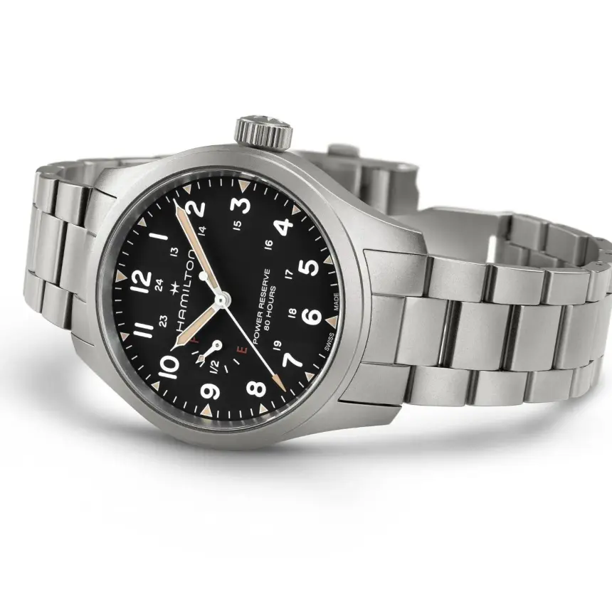 「カーキ フィールド メカ パワーリザーブ」は、「カーキ フィールド」コレクションの伝統的なデザインと欠かせない機能性を尊重しながら、現代的な機能や、最新のウォッチメイキング技術や革新性を取り入れています。ETA社がハミルトンのためだけに開発した、新しいH-23手巻きムーブメントを搭載し、初めて標準持続時間80時間をダイヤル上で直接確認することができるようになりました。ステンレススチール製メタルブレスレットを備えたブラックのダイヤルには、誇らしげに「power reserve 80 hours」(標準持続時間80時間)と表示され、「F」で満タンを、「E」で空であることを示し、実用性を重視したこの特別な機能を強調しています。