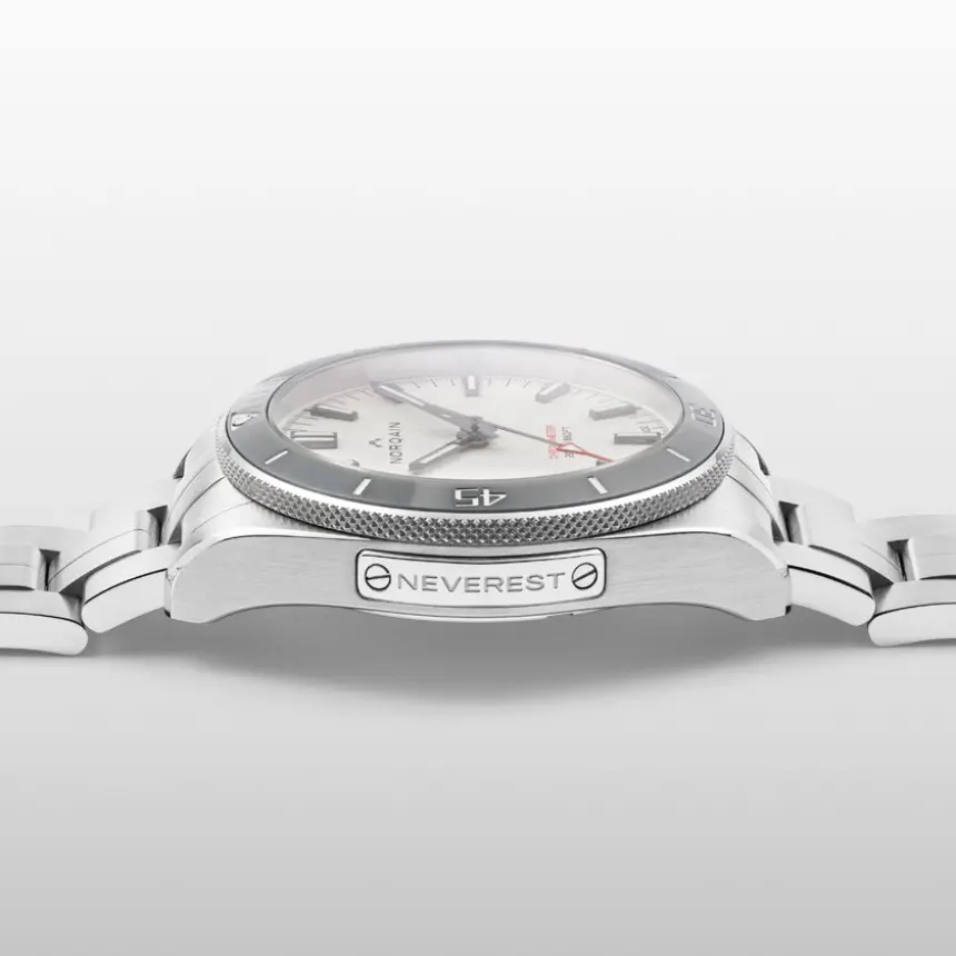 200m防水を備えた堅牢な40mmケースに、グレーセラミックベゼルを採用した洗練のシルバートーン。マイクロアジャスト付ブレスレットが高い装着感を実現し、あらゆるフィールドでの冒険をサポートします。