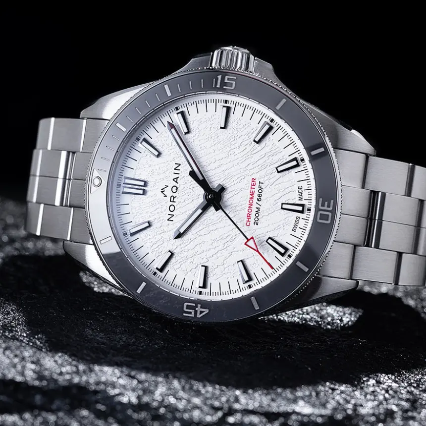 「ネベレスト」は、休むことなく挑戦を続けるノルケインの姿勢そのものです。このグレーシャーモデルの文字盤に刻まれたパターンは、エベレスト登頂の難所「クンブ氷瀑」のクレバスをイメージ。頂きを制した者だけが見ることのできる、圧倒的な感動を表現しています。