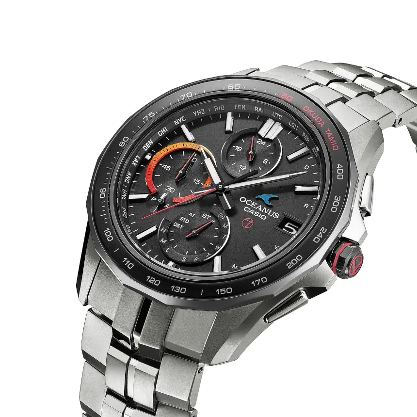 サファイアガラスベゼルのタキメーターには「OKUDA TAMIO」の文字と生誕60周年を祝い「60」の文字を赤色にした特別仕様。9時側のインダイアルリングは、自身の好きな色であるオレンジと赤のグラデーションデザインを採用しています。