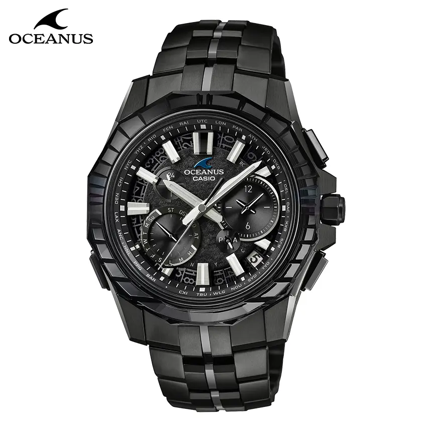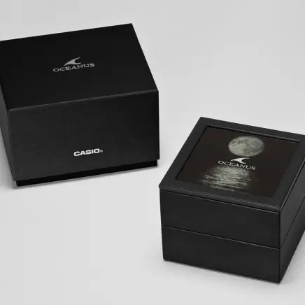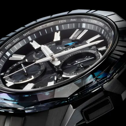 海との親和性を深めながら、どこまでも上質、あくまでも先進を貫くブランド哲学。その成熟と革新が紡ぐオシアナスのストーリーに、特別仕様の限定モデルが加わります。 上質な仕上げと薄く美しいフォルムを追求している「OCEANUS Manta(オシアナス マンタ)」ライン。 OCW-SG1000CNは、オシアナスが誇るものづくりの技術と日本の伝統技法が美しく融合したモデルです。 デザインテーマは、「CALM NIGHT」。 月の光に照らされた静かな海を、オールブラックのチタン外装と江戸切子のサファイアガラスベゼルで表現しました。 千筋とよばれる伝統文様を刻んだベゼルは、江戸切子職人・堀口徹氏自ら意匠を監修。匠の技を駆使した繊細かつ精密なカッティングで、夜空に輝く月明かりとその明かりが彩る海を描きました。透明感のなかに深みと輝きを生み出す色調は、ブラックとシルバーのグラデーション蒸着によるもの。どこまでも続くような広大な海を表現し、見る角度によってブルーに偏光することで、オシアナスらしい表情を醸し出します。 月面をイメージしたダイアルには、型打ちで目付を施した金属素材を使用。発電効率を飛躍的に向上したガリウムタフソーラーの搭載により、文字板装飾の自由度を高めています。 オシアナスが追求するこだわりのものづくりを体現した特別モデル。世界限定600本でお届けします。