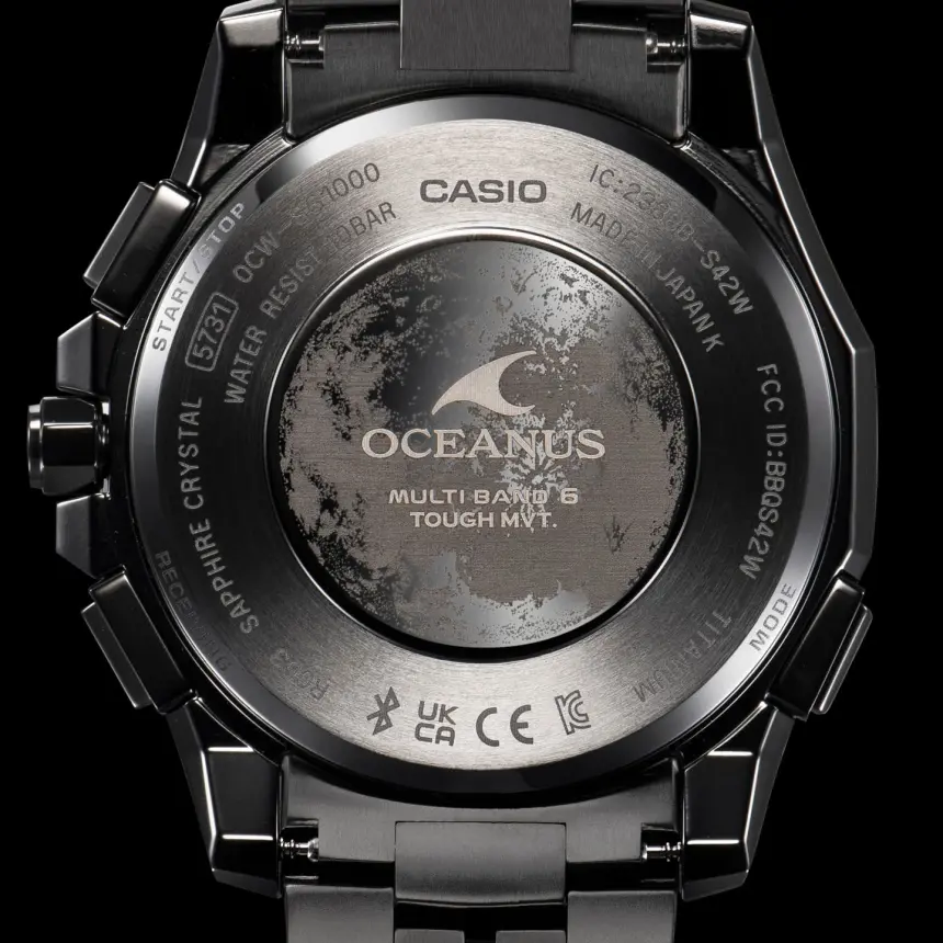 ダイアル外周をカットアウトし、日車を大胆に露出した独創的なフェイス。なかでも本モデルのキャラクターを最も強く印象づけるのが、月面をモチーフにデザインされた金属製のメインダイアルです。煌々と輝く月の表情を写し取った立体感のある陰影表現、細かい砂に覆われた質感を、型打ちによる目付で表現。めっきと塗装を重ねてブラックに着色し、塗膜ラップを入れるという手の込んだ仕上げが施されています。 肉抜き加工を施した金属製の日車にグレー蒸着、ダイアルリングにブラックIPをあしらうなど、各パーツに異なる着色を施しながら、全体イメージをモノトーンに統一。発電効率を飛躍的に向上したガリウムタフソーラーの採用により、従来の半透過素材のダイアルにはない装飾・加工・仕上げを実現しました。 さらに、裏蓋のエンブレムにも月のモチーフを採用。DLCコーティングとレーザー処理で陰影に差を出し、月面を背景にオシアナスのロゴが浮き立つ特別仕様のデザインに仕上げています。