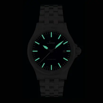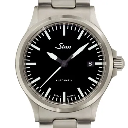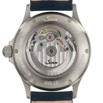 航空機のコックピットクロック由来の読み取りやすく落ち着いた艶のある**ブラックダイヤル**と、ソリッド感の高いサテン仕上げのステンレススチールケースを備えた556シリーズの基本モデルです。時・分・秒と日付表示のみに特化したシンプルなデザインで、防磁性、防水性といった**DIN規格(ドイツ工業規格)**に基づき製作されています。