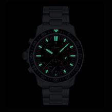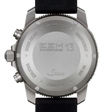 EZM13.1はプロフェッショナル・ダイビングのためにデザインされた機械式腕時計です。ダイビングの際には視認性が重要な役割を果たすため、EZM13.1には信頼性の高いSinnキャリバーSZ02ムーブメントを搭載しています。SZ02の特筆すべき点は、60分積算計です。通常の30分積算計に比べ、ゼロから60までの分計測の読み取りが容易で、6時位置に独立して大きくレイアウトされているため、抜群の視認性を誇ります。もうひとつの特徴は逆位置に配置されたリューズとプッシュピースです。これは腕の動きを妨げず、重火器などにリューズが引っかかることのない、ジンがミッションタイマーに採用している安全設計です。さらにお馴染みのジン・テクノロジーを満載し、プロフェッショナル・ダイバー垂涎の信頼性と高いパフォーマンスを保証しています。