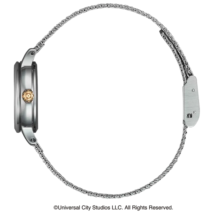 白蝶貝文字板にお花や蝶をちりばめ、インデックスはグリンダの仕草やカールした髪、魔法の杖をイメージしてデザイン。2時と8時の位置にはオーロラカラーと淡いパープルのクリスタルガラスをセットしました。裏ぶたには『Wicked: For Good』のロゴを刻印し、グリンダのシルエットがあしらわれたスペシャルBOX付きです。