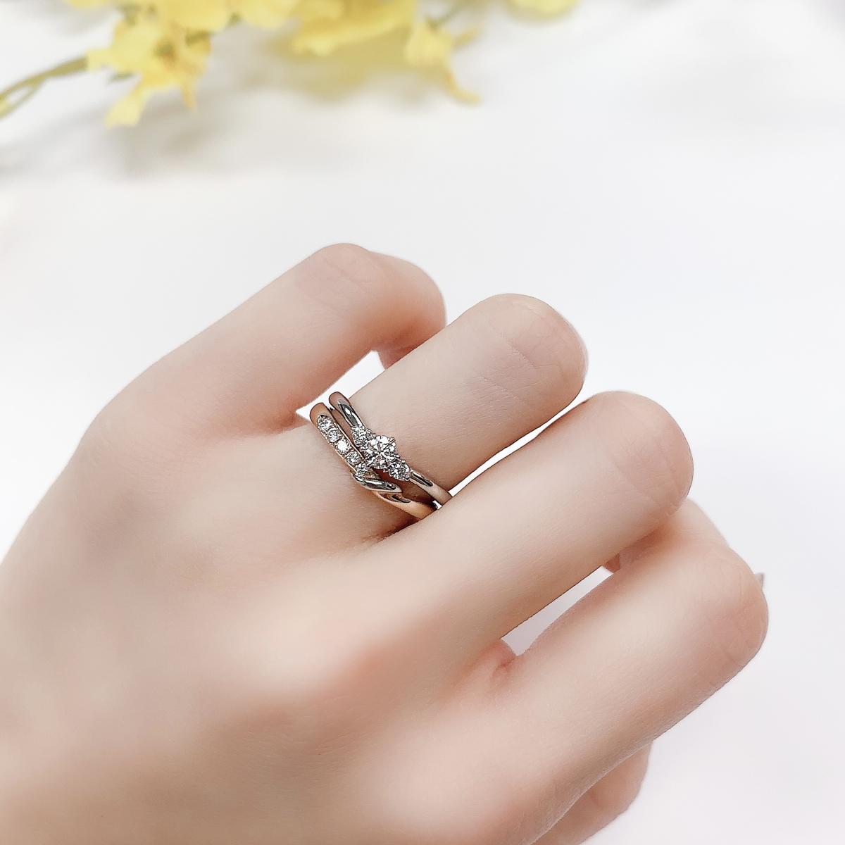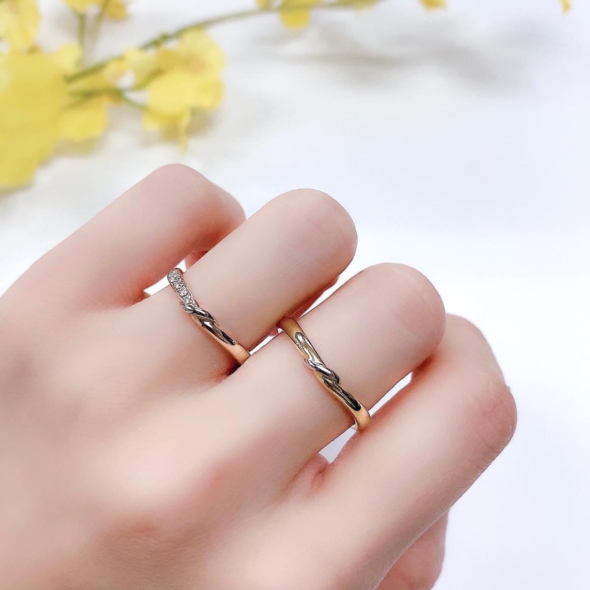 日記帳をめくるたびに、ふたりで過ごしてきた日々の美しい想い出、楽しい想い出、フィルムが巻き戻るようにその瞬間が蘇る。そしてこれからはかけがえのない家族として、新たなページにふたりの未来日記が綴られていく。結婚指輪「ダイアリー」に込められた思いです。美しいカーブラインを描くVリングの両サイドにはK18ゴールドでこれまでの想い出や、これからの希望を表現しました。中央のプラチナ部分で鍵の付いた日記帳の帯を表現しています。リング内側を丸く「内甲丸」にして滑らかな着け心地、リング強度を決定づける手の平側にしっかりとした厚みがあるため、変形に強いのが特長です。婚約指輪「ダイアリー」との重ね着けでさらに華やか、可憐に美しく輝きます。