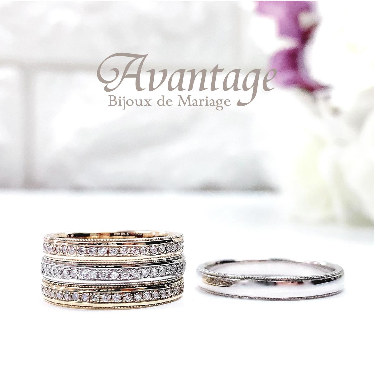 「千の粒」という意味のミル打ち(ミルグレイン)はヨーロッパで古くから伝わる装飾技法。永遠、長寿、子孫繁栄の意味を持つ縁起のいいデザインです。熟練職人の息吹が伝わってくるようなアンティーク調のイメージが魅力です。「アヴァンタージュ」のリングは内側を丸く「内甲丸」にして滑らかな着け心地、リング強度を決定づける手の平側にしっかりとした厚みがあるため、変形に強いのが特長です。レディース用にはメレダイヤ3石付きとハーフエタニティタイプをご用意。男性様から人気です。シンプルモダンでありながら、どこかアンティーク感漂う魅力的なリングです。