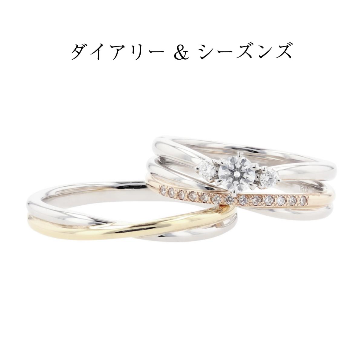 「シーズンズ」のレディース用には、0.1ctエクセレントカットダイヤモンド付きのエンゲージリングを兼ねるマリッジリングとして「ブリッジリング」と呼ばれるタイプと、メレダイヤモンドが美しく連なるハーフエタニティタイプの2種類をご用意。コンビカラーでPt部分とK18部分のクロスはふたりの約束、指切りげんまん。男性様の指もほっそり長く美しく魅せるデザインです。リング内側を丸く「内甲丸」にして滑らかな着け心地、リング強度を決定づける手の平側にしっかりとした厚みがあるため、変形に強いのが特長です。これから何10年も繰り返し巡ってくる季節、おふたりがずっと幸せでありますようにとの願いを込めました。結婚指輪「シーズンズ」と「メモリーズ」はシリーズ作となっているため、それぞれのお好みでお選び頂いても、違和感なくペアリングにすることが出来ます。