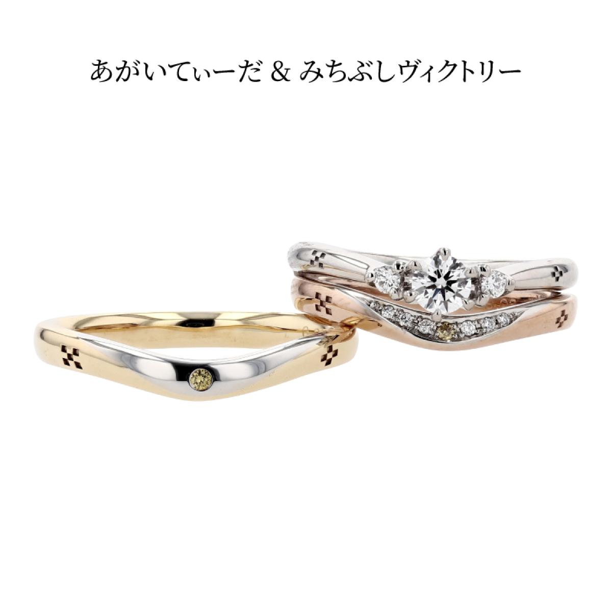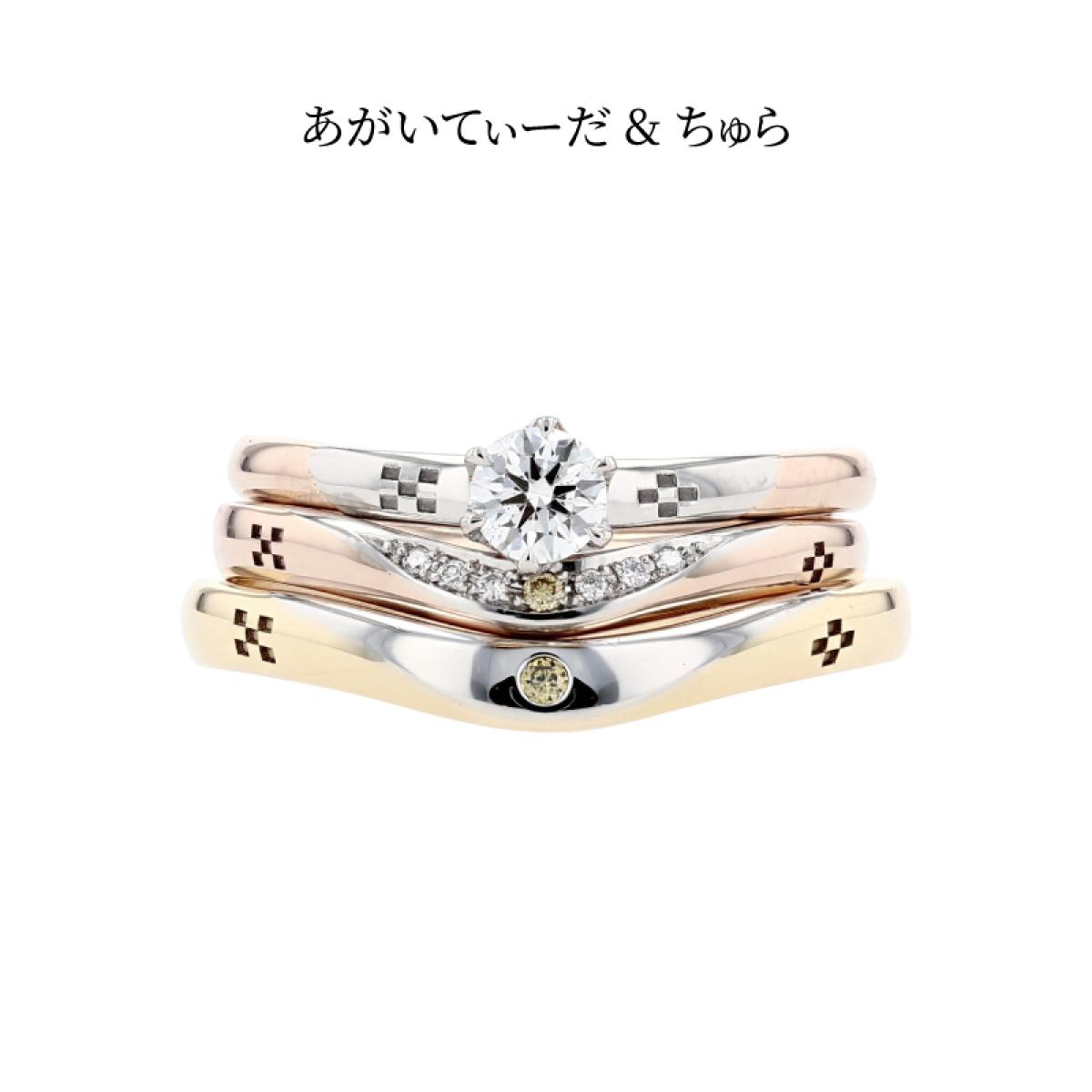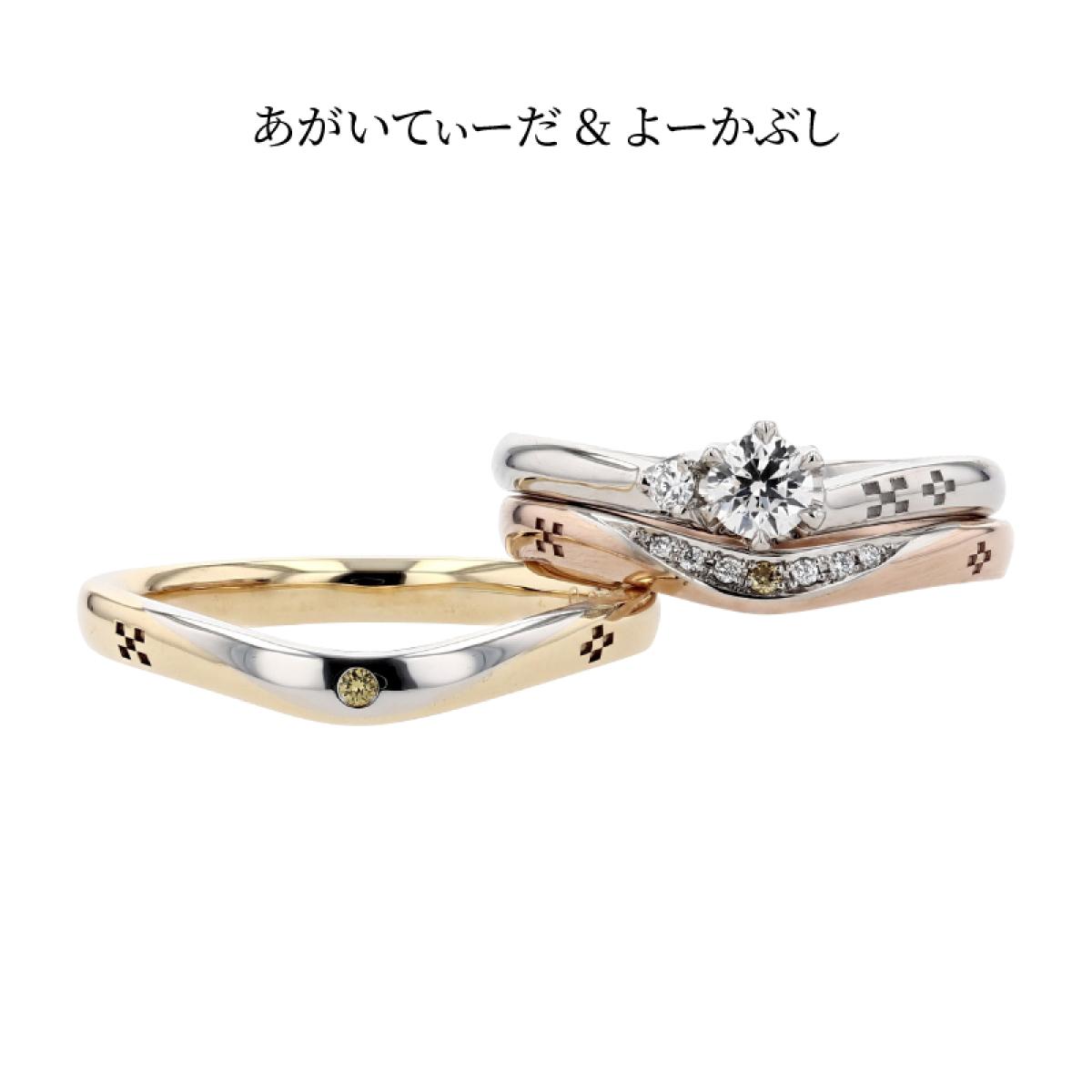沖縄の海から上がってくる、まばゆいほどの朝陽で,雲がオレンジ色に染まる様子を結婚指輪に表現しました。K18の部分で朝焼け雲、プラチナ部分で太陽の周りの耀きをイメージ。希少で高価、カナリアの黄色に例えられる「カナリーイエローダイヤモンド」を女性用はダイヤグラデーションの中心に、男性用にも1石をセットしました。リング内側を丸く「内甲丸」にして滑らかな着け心地。太陽の象徴カナリーイエローダイヤモンドが、いつまでもおふたりの指で耀き、未来を照らし続ける事を願って。