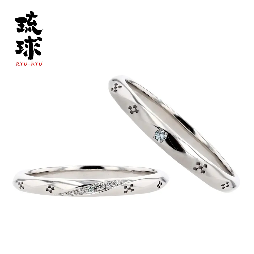 沖縄で、風車は健康と長寿、幸福のシンボルとされています。97歳の数え年には風車を持ってオープンカーでパレードするなど、最も盛大な生年祝いが催されます。そんな縁起の良い、かじまやー(風車祭)を結婚指輪に表現しました。メンズ、レディースリングの中央には風のシンボルとして、アイスブルーダイヤをセット。5つの斜めの面から成るデザインで、くるくる回る風車を表現。リング内側を丸く「内甲丸」にして滑らかな着け心地。またメンズの2面にはヘアライン加工を施し、回転するイメージを更に強調しました。いつまでも健康で長寿、幸福な人生がふたりに訪れる事を願って。沖縄の青い海の象徴アイスブルーダイヤモンドが、おふたりの新たな船出を見守ります。K18YG、K18PGでの制作対応モデルです。