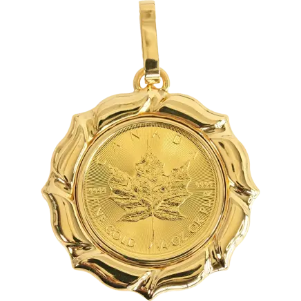 世界で最も信頼されている金貨の一つ、カナダ王室造幣局発行の「メープルリーフ金貨」。その1/4オンス純金コインを贅沢に使用した、上質な輝きを纏うペンダントです。コインを囲む専用のペンダント枠には、立体的でモダンなカットが施されており、光を美しく反射してジュエリーとしての存在感を一層引き立てます。