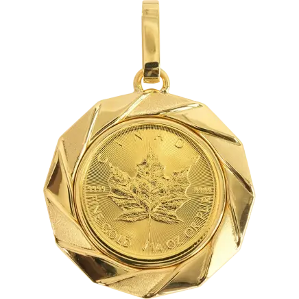 世界で最も信頼されている金貨の一つ、カナダ王室造幣局発行の「メープルリーフ金貨」。その1/4オンス純金コインを贅沢に使用した、上質な輝きを纏うペンダントです。コインを囲む専用のペンダント枠には、立体的でモダンなカットが施されており、光を美しく反射してジュエリーとしての存在感を一層引き立てます。
