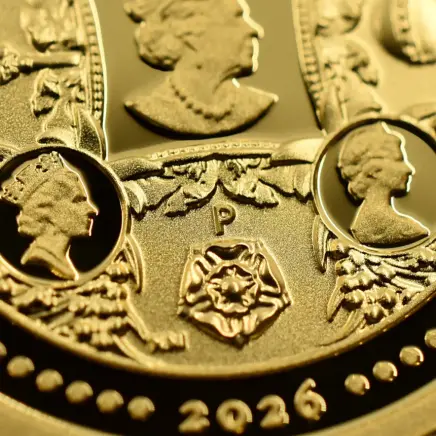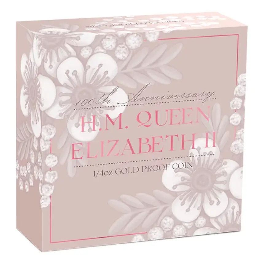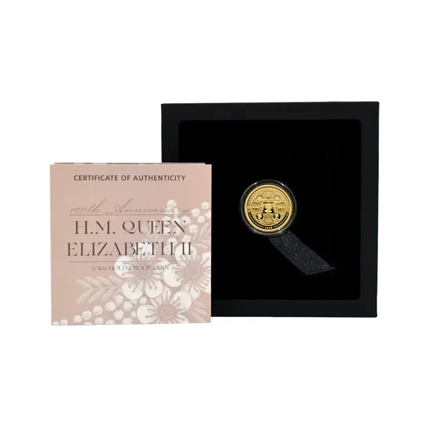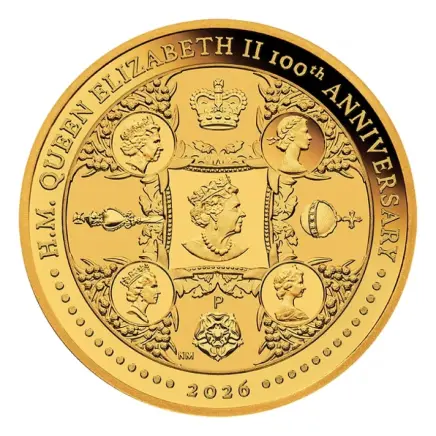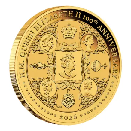 エリザベス2世の生誕100周年を祝し発行された、特別な純金コインです。コインには女王の歴代肖像があしらわれた華やかなデザインが施され、英国王室が歩んできた長い歴史と威厳を象徴しています。