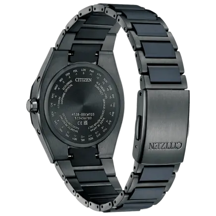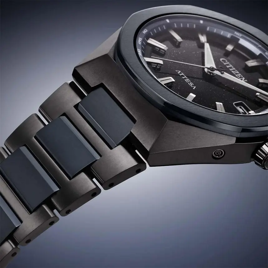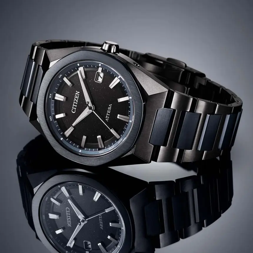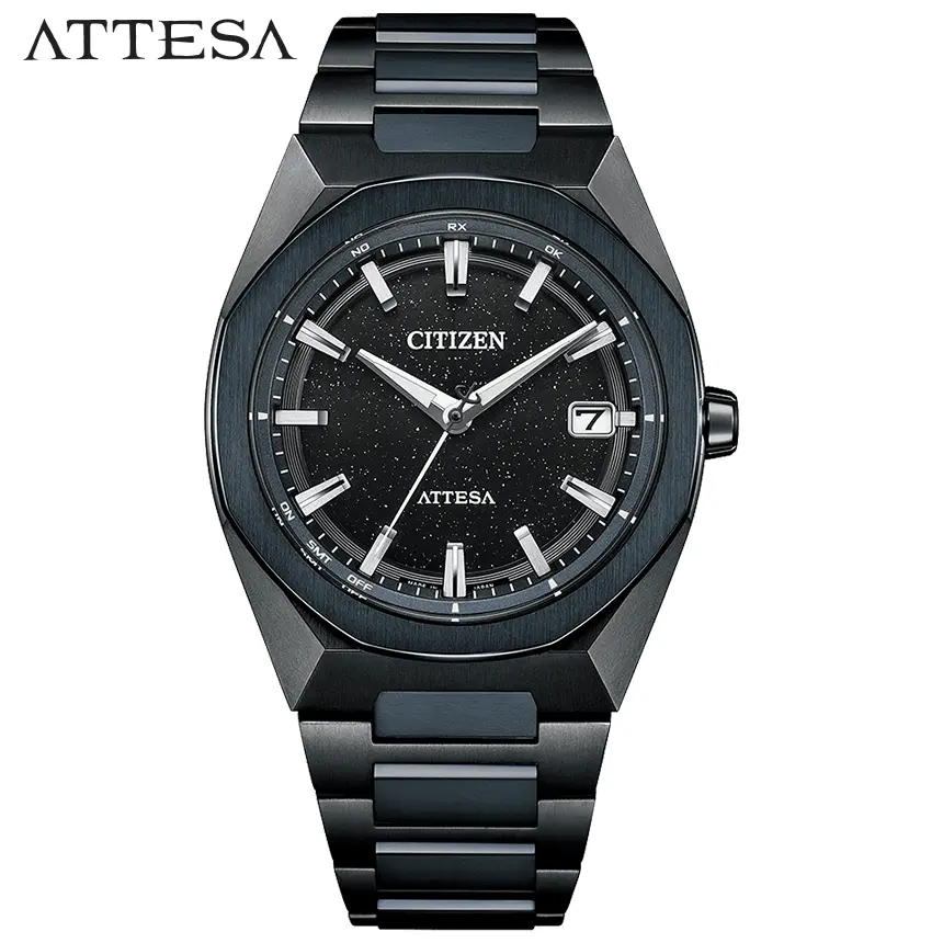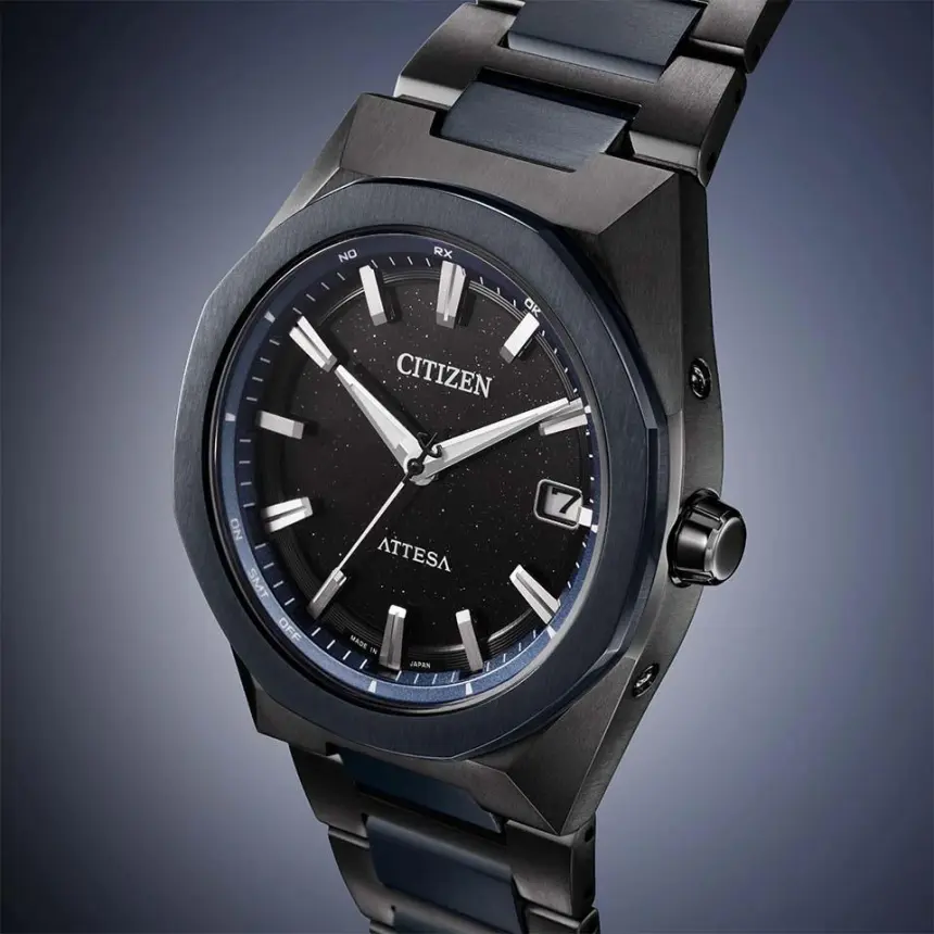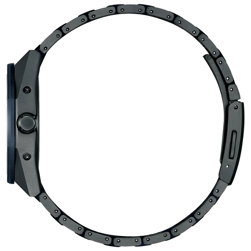 ベゼルとバンドの中駒にDLCブルーを採用。ラメを練り込んだブラックの文字板は、漆黒の静かな宇宙空間に浮かぶ星々を表現しました。ブラックとダークブルーの組み合わせが大人の落ち着きと特別感を演出します。