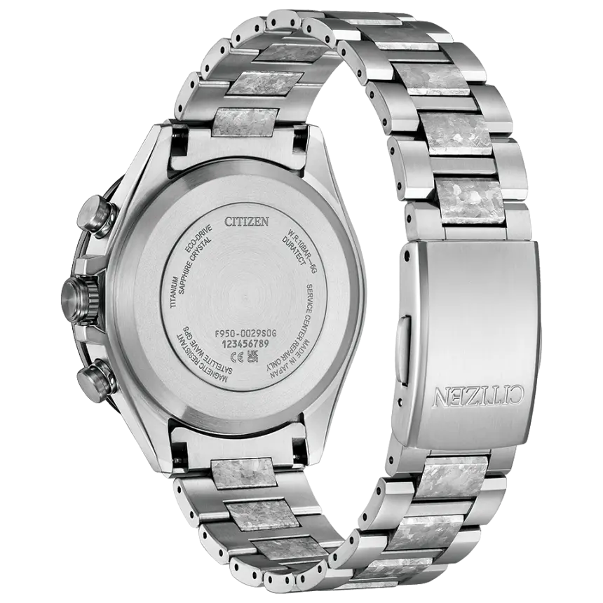 シチズン独自の技術で開発した**結晶チタニウムを中駒に採用**。デュラテクトプラチナを重ねることで結晶模様がプラチナの輝きをまとい、存在感を放ちます。ACT Lineにふさわしい、先進性と力強さを備えた限定モデルです。
