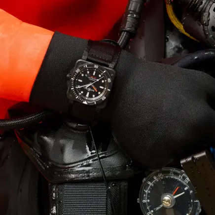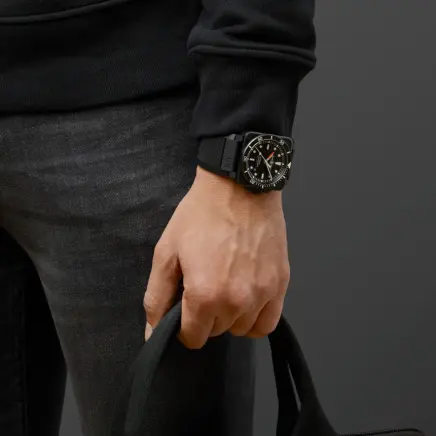 この「BLACK MATTE」モデルは、ケース素材にハイテクセラミックを採用。軽量でありながら極めて硬く、耐傷性に優れたマットブラックの筐体は、光の反射を抑え、プロフェッショナルが求める究極の視認性を実現しています。300m防水という本格性能を備え、深海の過酷な環境にも即座に対応する、真の計器としての風格を湛えています。