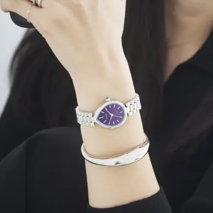 「Rain(雨)」と「Bella(美しい)」を組み合わせて名付けられた新コレクション“RAINELL”(レイネル)。地球を潤し、光を反射する雨の雫にインスピレーションを得た、彫刻的なフォルムが特徴です。優雅な曲線を持つドロップ形状のケースと、リズミカルな輝きを演出するボリュームある3列バンドをコーディネート。文字板には霧雨を思わせる繊細なヘアラインパターンを施し、クラシカルなインデックスが上品な表情を添えます。どの角度から見ても立体感と陰影が美しく際立つ、洗練された存在感を放つ一本です。