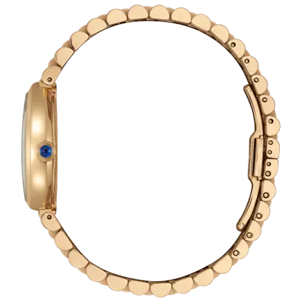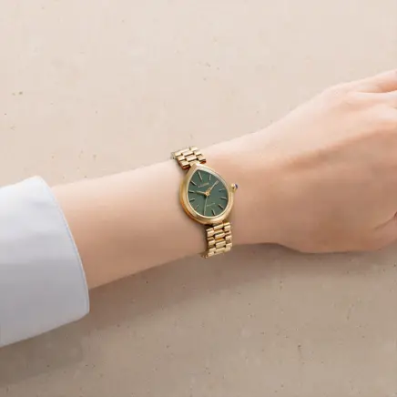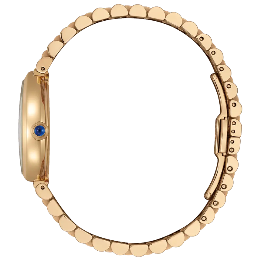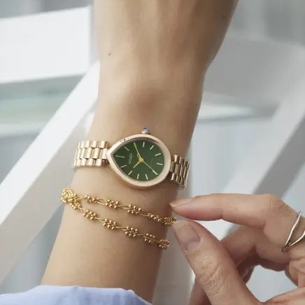 地球を潤し、光を反射する雨の雫にインスピレーションを得た“RAINELL”(レイネル)。優雅な曲線を持つドロップ形状のケースを、肌なじみの良いウォームゴールドで仕上げた、気品あふれるモデルです。腕の動きに合わせてリズミカルな輝きを演出する3列バンドと、霧雨を思わせる繊細なヘアラインパターンの文字板が調和し、洗練された手元を演出。どの角度から見ても立体感と美しさが際立つ彫刻的なフォルムが、日常にジュエリーのような輝きを添えてくれます。