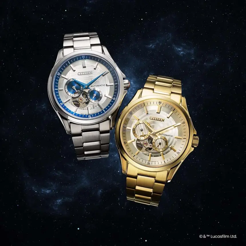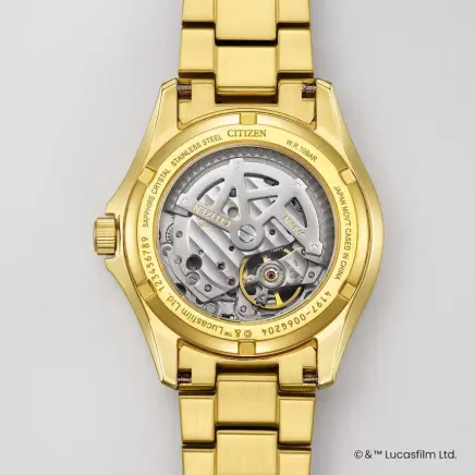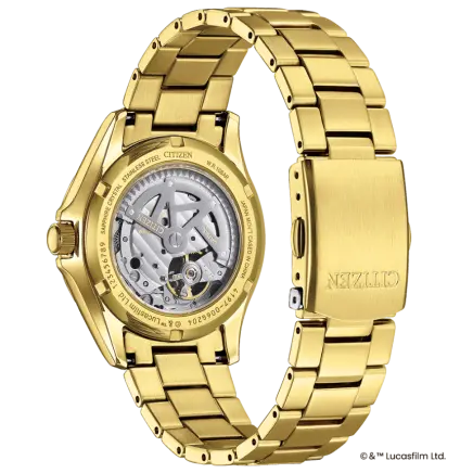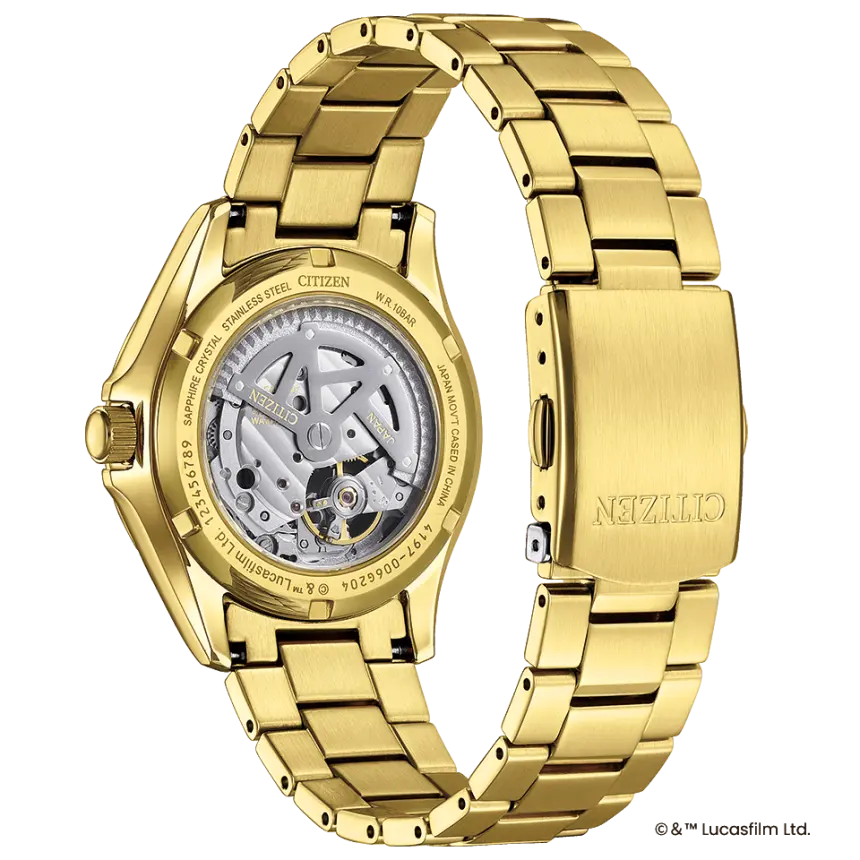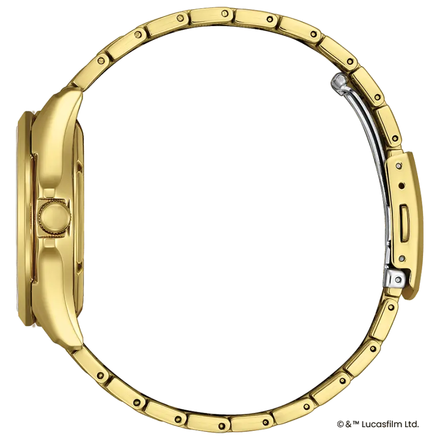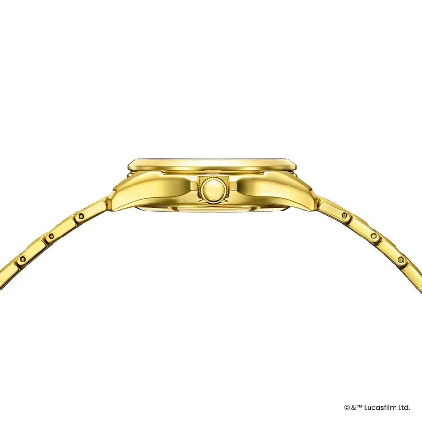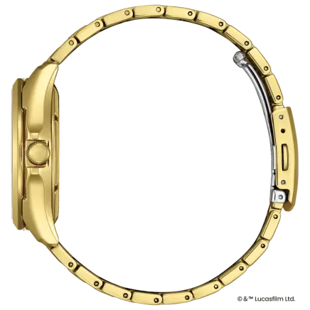 ゴールドを基調にまとめ、文字板には特徴的な腹部の円形をデザインしています。インダイヤルには「C-3PO」の目をイメージした模様が入っています。