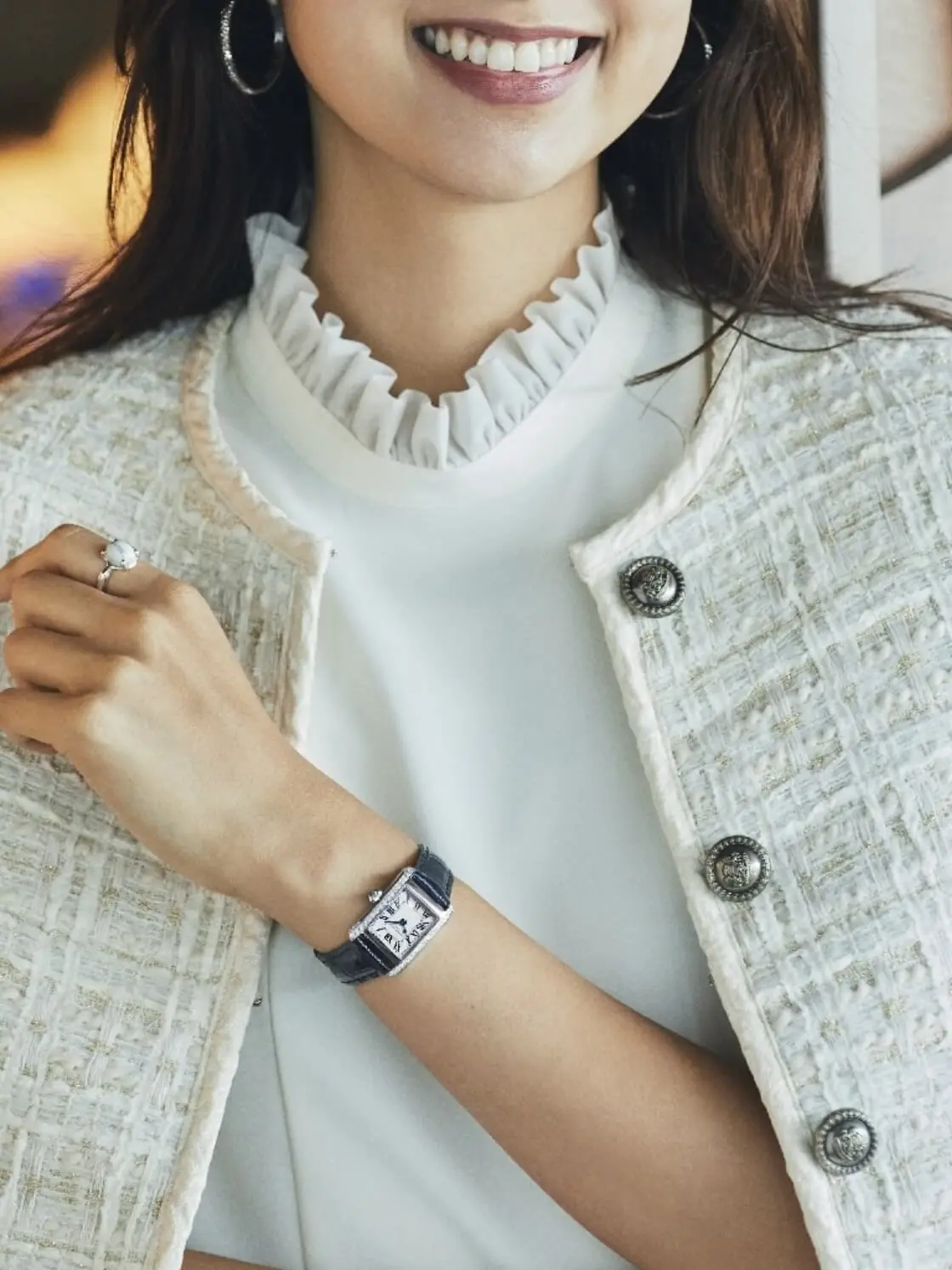 日本限定フランス語で「スクエア」を意味するカレ。1920年代後半に時代を博したエレガントでファッショナブルな女性からインスピレーションを受けたデザインです。スクエアケースに合わせてスクエアのミニッツトラックを配し、スペード時針とリーフ分針をあしらいました。リューズは古典的なオニオンシェイプ、インデックスはローマン数字といったクラシックなディテールこだわった上品な時計です。ケースサイドには34石のダイヤモンドを配し気品あふれる表情で手元を美しく飾ります。