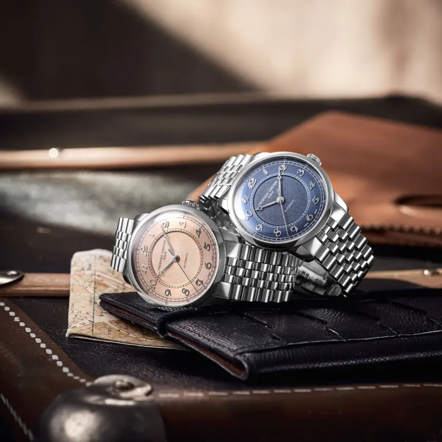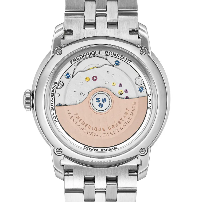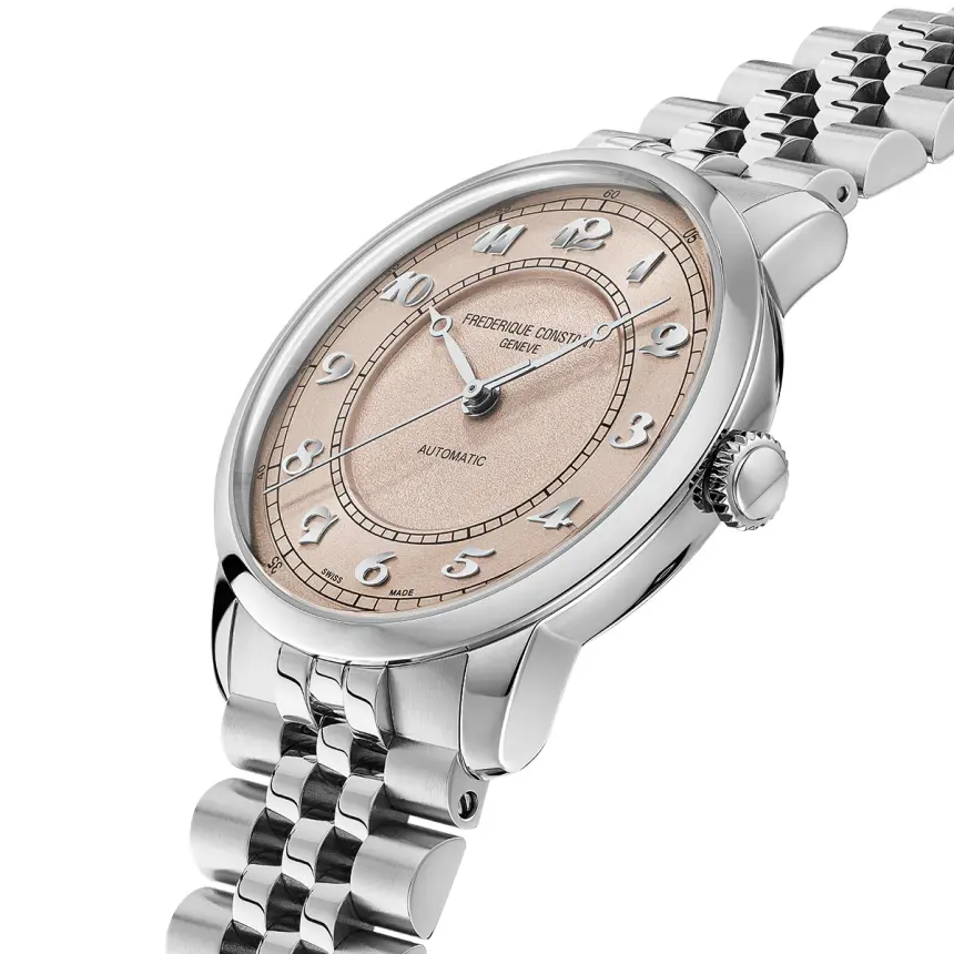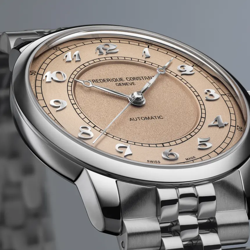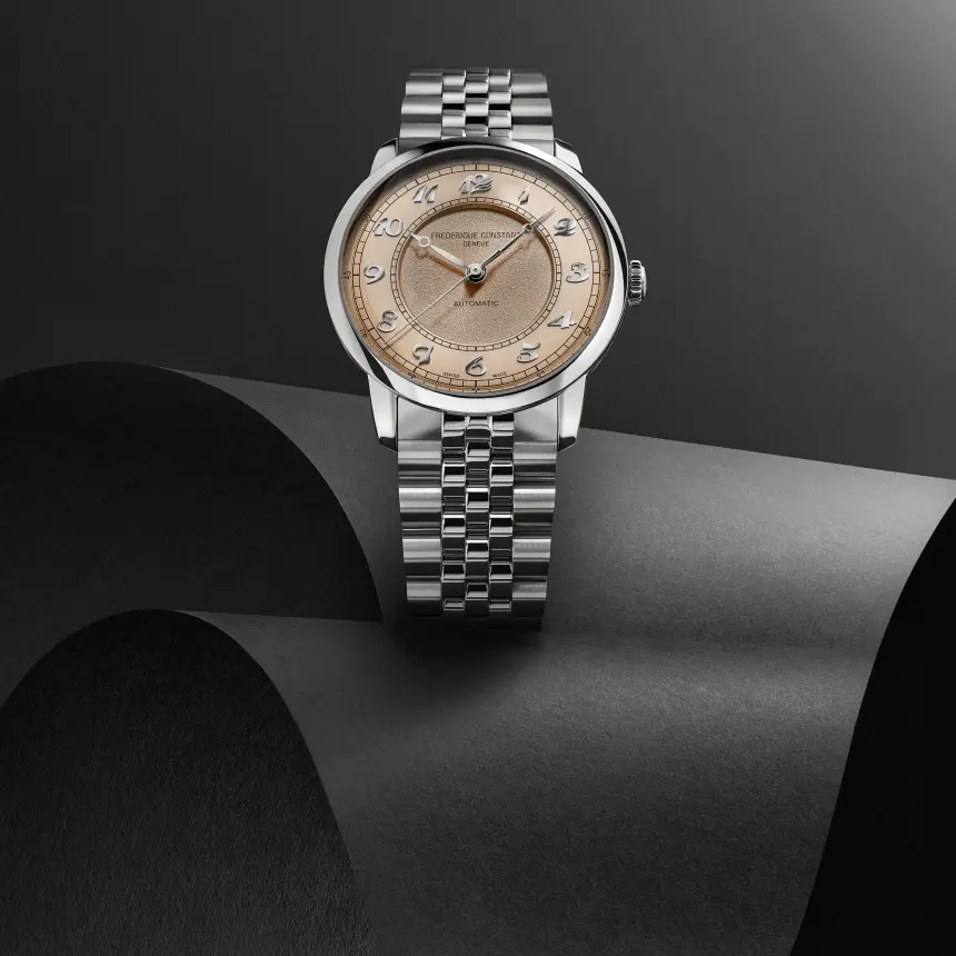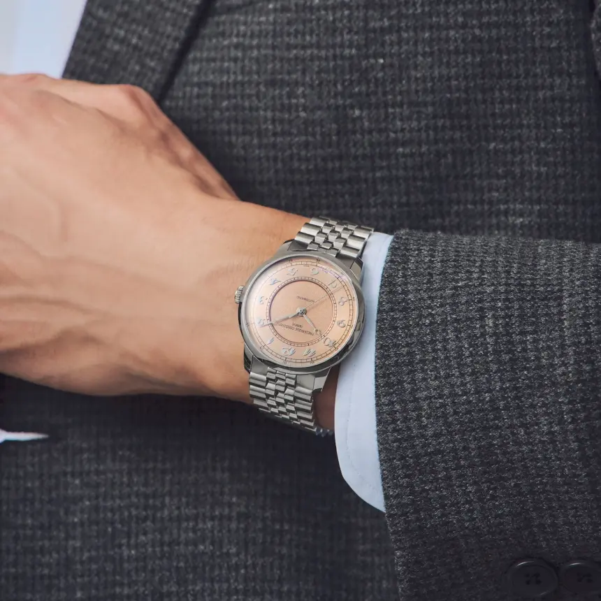 38.5 mm径サイズの自動巻きモデル「クラシック プレミア」。小ぶりなユニセックス仕様のサーモンピンクカラーのダイヤルに、半円形の5連ブレスレットを組み合わせました。中央から縁に向かい膨らむボンベダイヤルの中央は一段下げてグレイン、外周にはソレイユと凝った仕上げを施しました。クリスタルケースバックからは搭載したラ・ジュー・ペレ社のロングパワーリザーブムーブメントが覗きます。