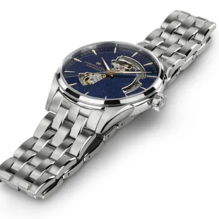 パワフルな内部機構を堪能できる「ジャズマスター オープンハート」。42mmのダイヤルを備え、その精巧さが周りの視線を釘付けにします。魅力的なミッドナイトブルーのダイヤルが輝くアイキャッチなタイムピース。都会的な設計が放つ現代性と、無限の宇宙を表現したカラーが融合したモデルです。ハミルトンの進化し続けるクラフツマンシップを体現したダイヤルには、自動巻きムーブメントH-10を採用。ニヴァクロン™製ヒゲゼンマイにより、磁気にも強く標準持続時間80時間を誇ります。