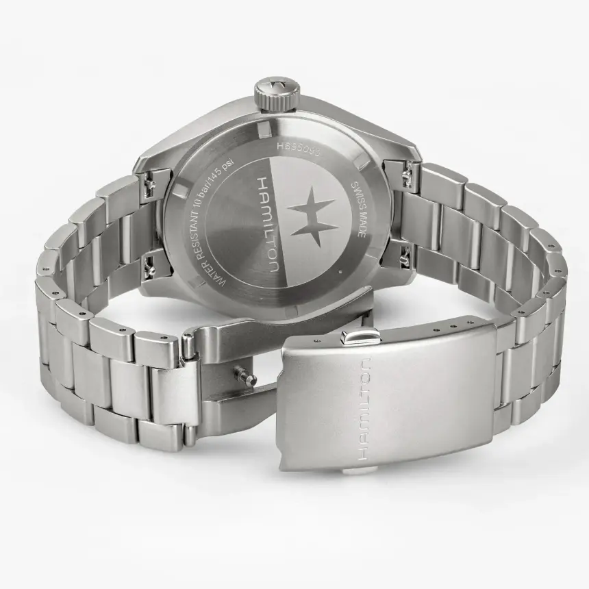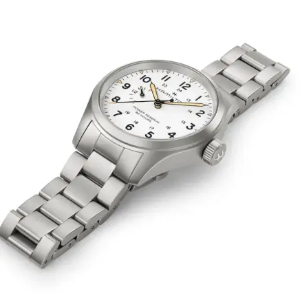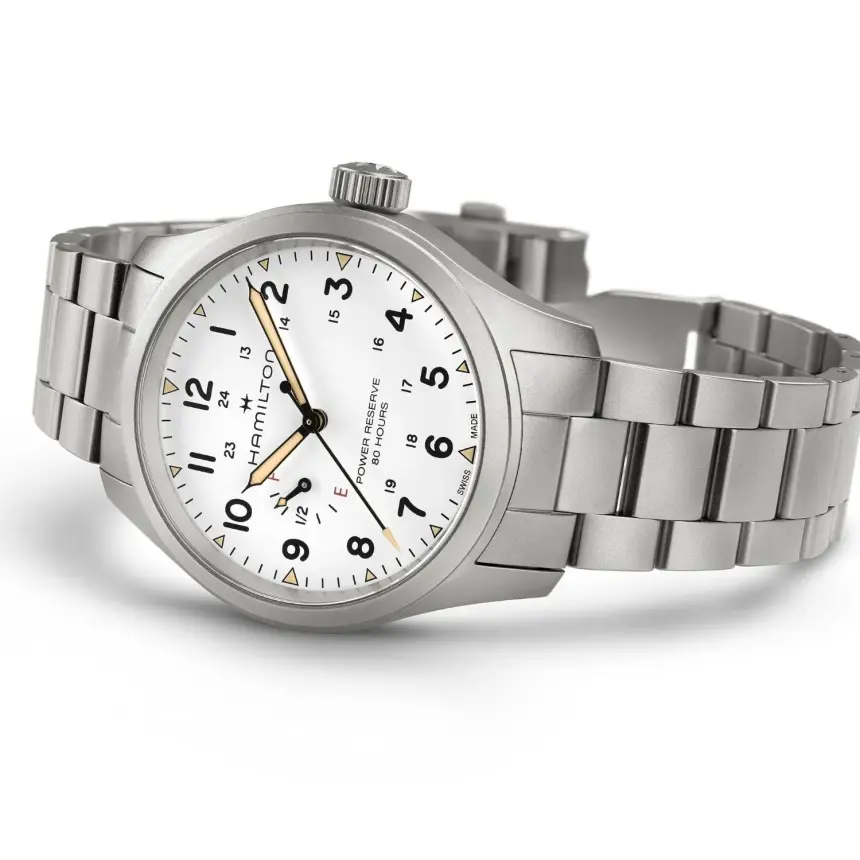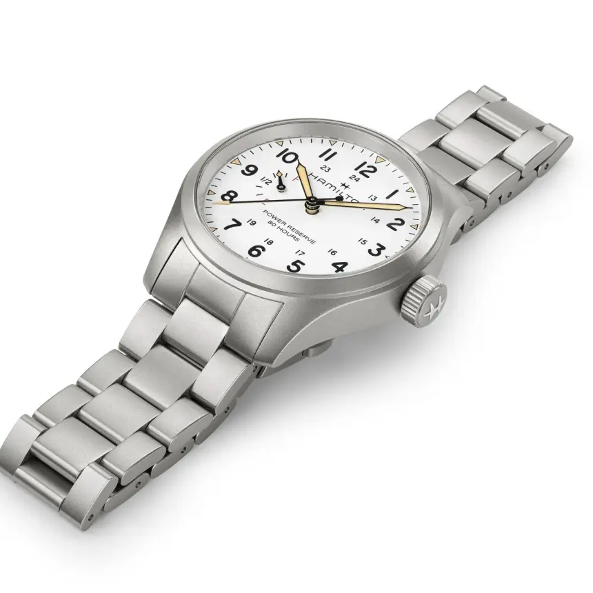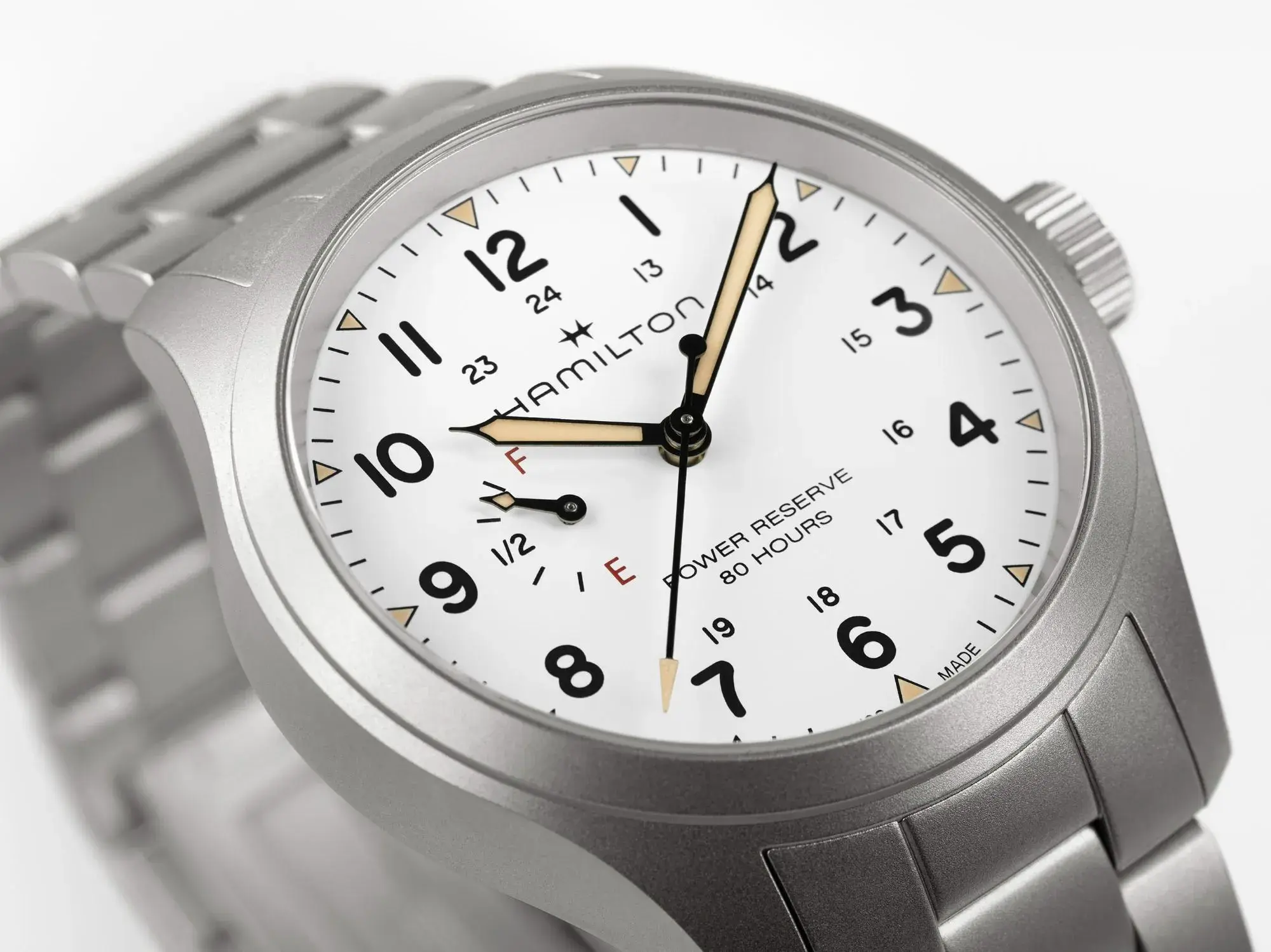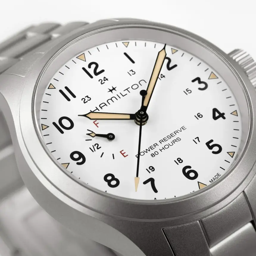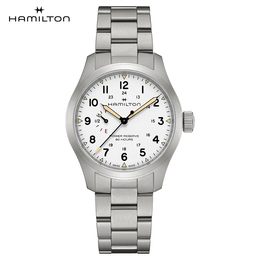 「カーキ フィールド メカ パワーリザーブ」は、「カーキ フィールド」コレクションの伝統的なデザインと欠かせない機能性を尊重しながら、現代的な機能や、最新のウォッチメイキング技術や革新性を取り入れています。ETA社がハミルトンのためだけに開発した、新しいH-23手巻きムーブメントを搭載し、初めて標準持続時間80時間をダイヤル上で直接確認することができるようになりました。ステンレススチール製メタルブレスレットを備えたホワイトのダイヤルには、誇らしげに「power reserve 80 hours」(標準持続時間80時間)と表示され、「F」で満タンを、「E」で空であることを示し、実用性を重視したこの特別な機能を強調しています。