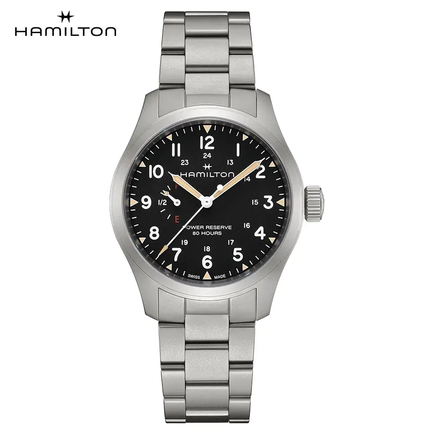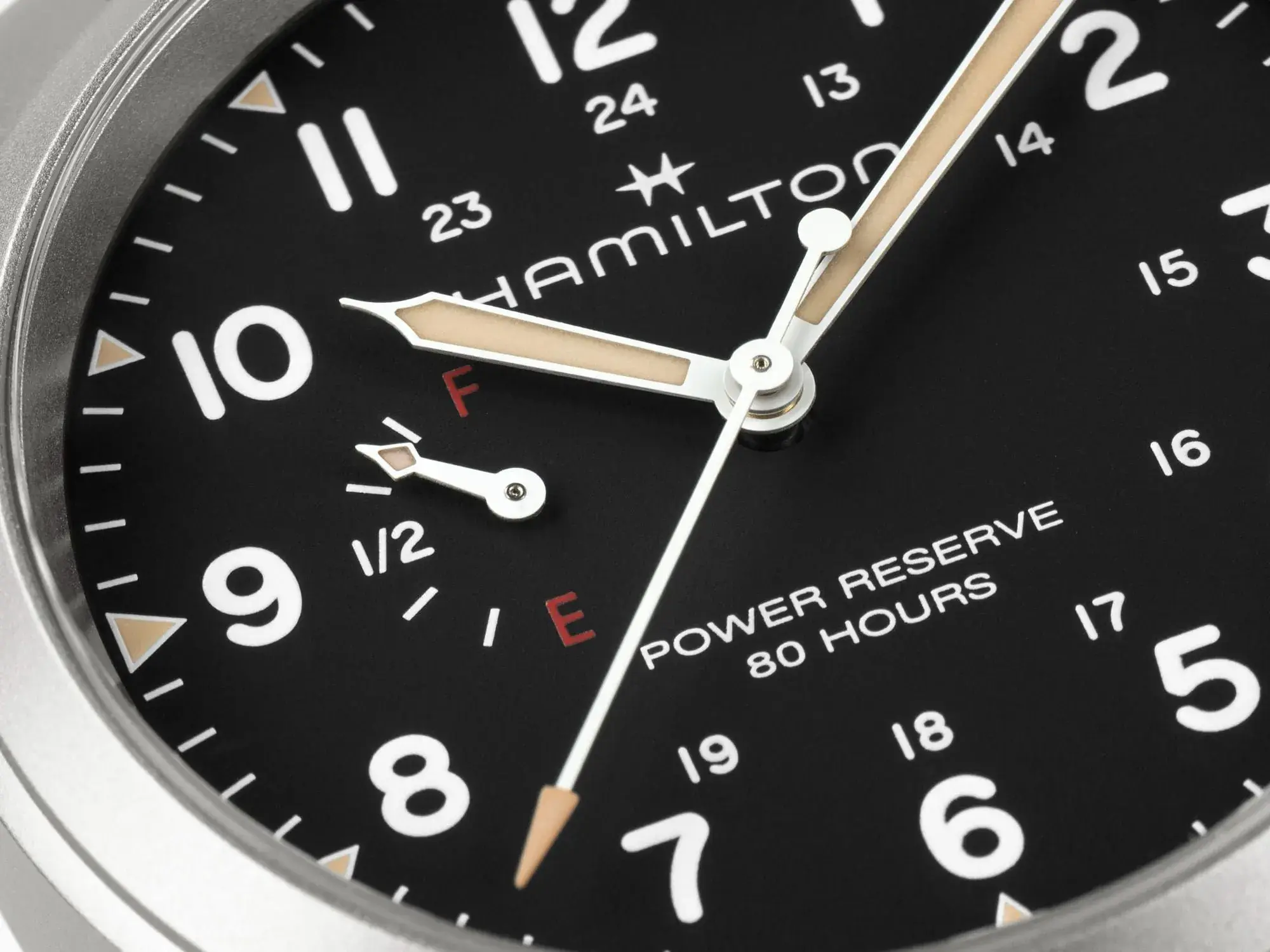 「カーキ フィールド メカ パワーリザーブ」は、「カーキ フィールド」コレクションの伝統的なデザインと欠かせない機能性を尊重しながら、現代的な機能や、最新のウォッチメイキング技術や革新性を取り入れています。ETA社がハミルトンのためだけに開発した、新しいH-23手巻きムーブメントを搭載し、初めて標準持続時間80時間をダイヤル上で直接確認することができるようになりました。ステンレススチール製メタルブレスレットを備えたブラックのダイヤルには、誇らしげに「power reserve 80 hours」(標準持続時間80時間)と表示され、「F」で満タンを、「E」で空であることを示し、実用性を重視したこの特別な機能を強調しています。