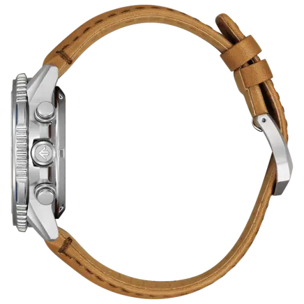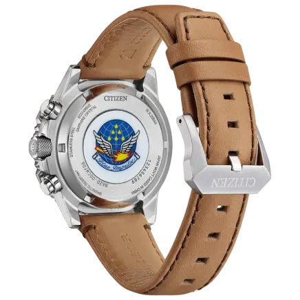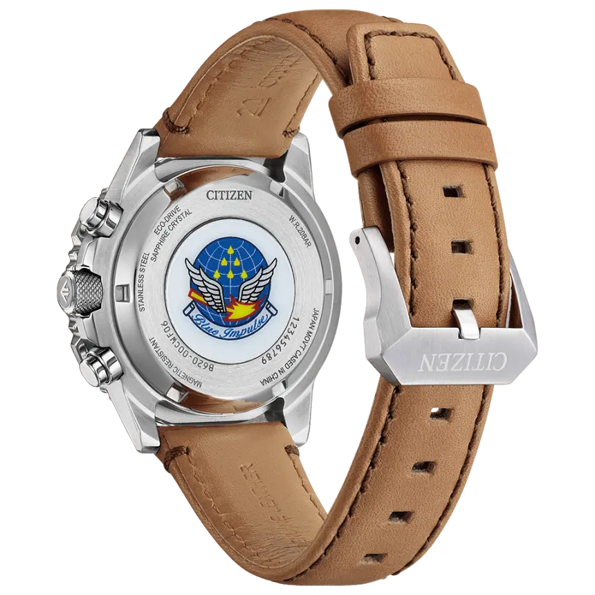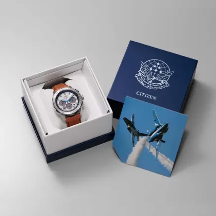 2025年に創設65周年を迎える航空自衛隊アクロバット飛行チーム「ブルーインパルス」の限定モデル。本モデルは精悍なシルバーダイヤルにブルーのアクセント、そして風格漂う牛革バンドを組み合わせた世界限定500本の希少なエディションです。ケース径40mmのコンパクトなサイズ感は、プロフェッショナルな計器としての機能美を保ちつつ、日常の装いにも洗練された印象を与えます。文字板と裏ぶたにはチームのエンブレムを刻印。専用ボックスにはT-4の飛行シーンを印刷したカードを同梱した、コレクター心をくすぐる珠玉のパイロットウオッチです。