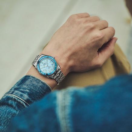 またダイヤルパターンには、太い直線と細い直線を組み合わせ、繰り返し打ち寄せる波のリズムを幾何学的模様で表現しました。レギュラーモデルは、軽やかなライトブルーのダイヤルとブルーのベゼルを組み合わせています。