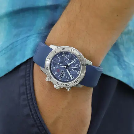 オリジナルを彷彿とさせるサンレイ仕上げのブルーダイヤルは、ケース径43mmへとサイズアップ。外観はスクリュー式プッシュボタンに見えますが、実際には非ねじ込み式で素早い操作が可能です。二重パッキン構造により30気圧防水を維持しつつ、水中でのクロノグラフ操作をも可能にしています。認証機関DNVによる厳格な認定を受けた、プロフェッショナルのためのダイビングクロノグラフです。