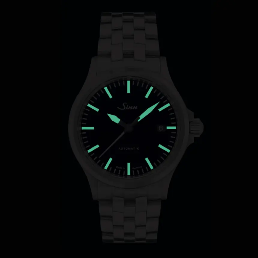 時計の必要最小限の機能である時・分・秒と日付表示のみに特化したシンプルなデザイン。防磁性(**4,800A/m**)、防水性といった**DIN規格(ドイツ工業規格)**に基づき製作されており、普遍的な機能美と耐久性を両立しています。