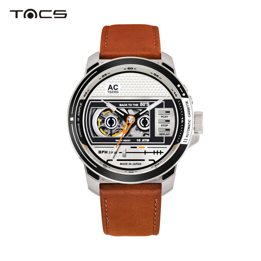 昭和や平成初期、音楽と共にあったあのカセットテープが、再び現代のライフスタイルに彩りを加えます。TACSの「Automatic Cassette」は、クラシックなカセット・プレーヤーの造形を腕時計に落とし込んだ、センチメンタルな価値を現代的な感性で再定義したタイムピースです。