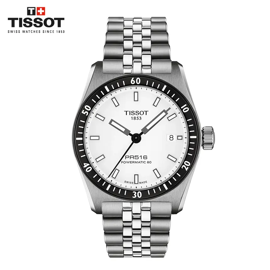 1965年の伝説的モデルをルーツに持つ「Tissot PR516」。38mmの絶妙なケースサイズに、最大80時間のロングパワーリザーブを誇るスイス製ムーブメントを搭載しました。ブラックPVDコーティングを施したケースと、爽やかなホワイトダイヤルのコントラストが、手元にモダンで力強い印象を与えます。サファイアクリスタルガラスや10気圧防水など、実用性も極めたタイムピースです。