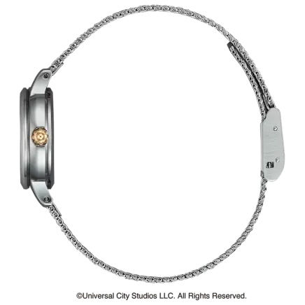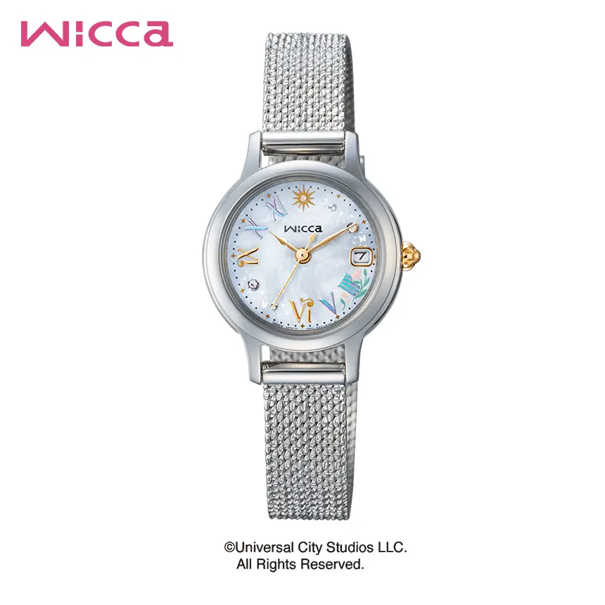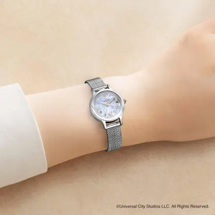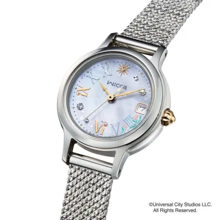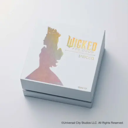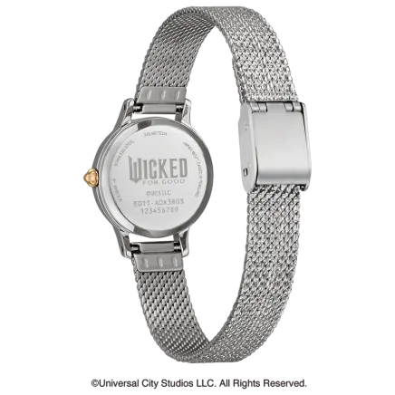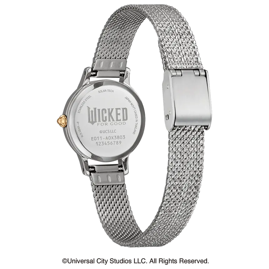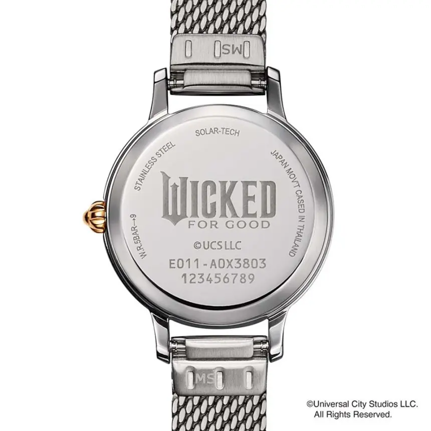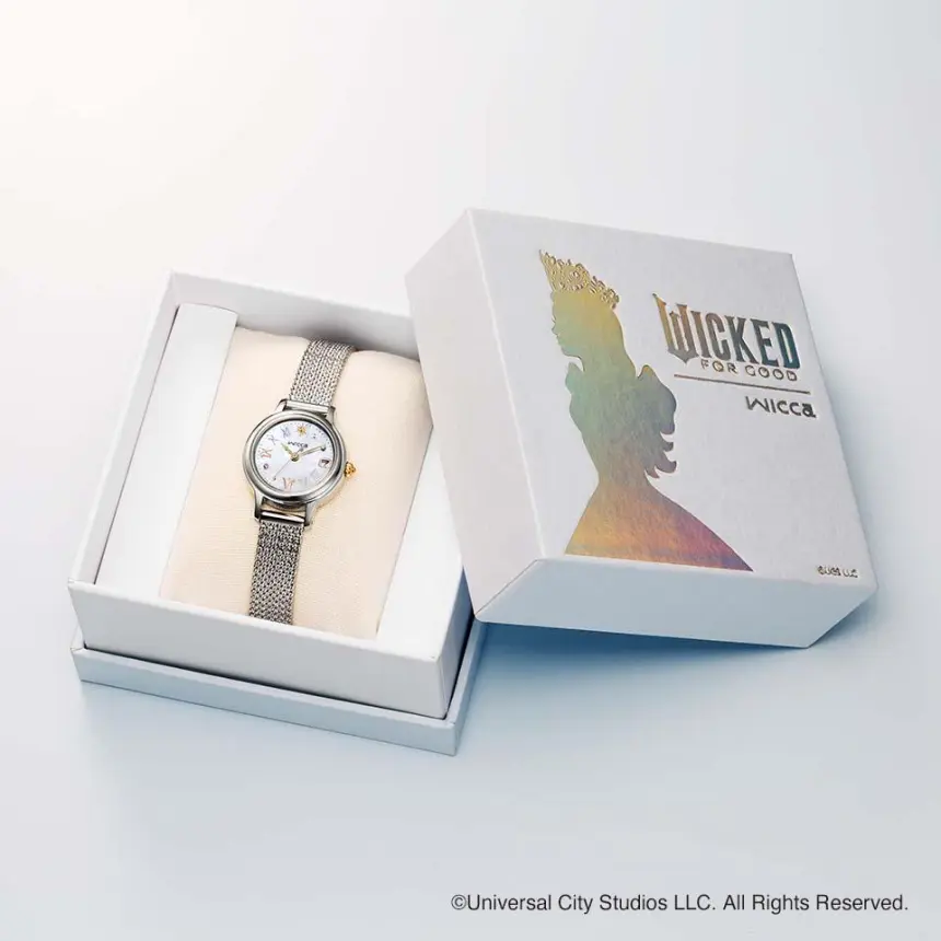白蝶貝文字板にお花や蝶をちりばめ、インデックスはグリンダの仕草やカールした髪、魔法の杖をイメージしてデザイン。2時と8時の位置にはオーロラカラーと淡いパープルのクリスタルガラスをセットしました。裏ぶたには『Wicked: For Good』のロゴを刻印し、グリンダのシルエットがあしらわれたスペシャルBOX付きです。