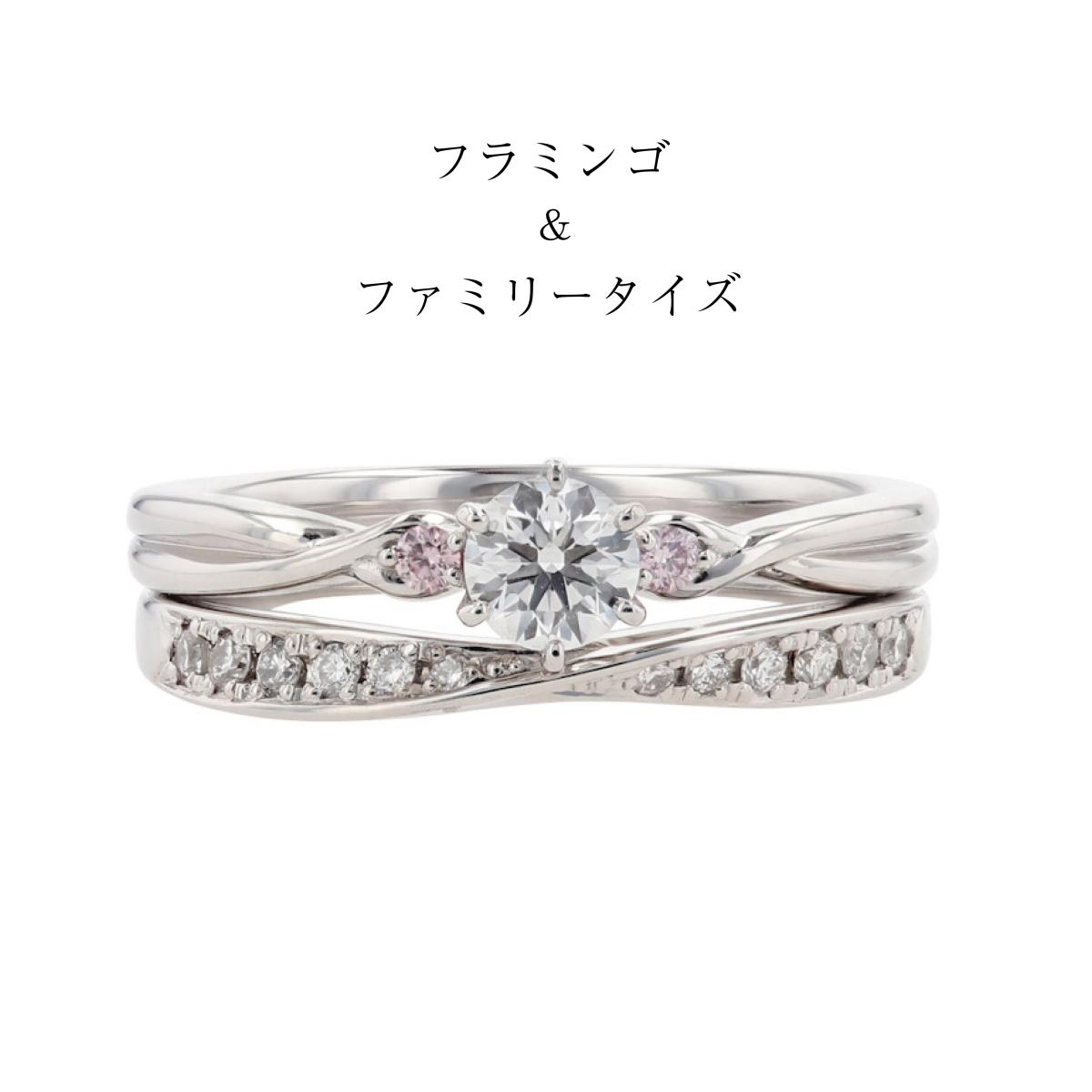 「家族の絆」を意味する「ファミリータイズ」。ストレートタイプの結婚指輪をメビウスリングにしました。途切れる事のない永遠の愛を象徴する「メビウスの輪」。面を一周すると同じ場所に戻ります。何度回っても終わりが無い事から「永遠」を意味するようになりました。永遠の家族愛をテーマにした「ファミリータイズ」、リング内側を丸く「内甲丸」にして滑らかな着け心地、細身であってもリング強度を決定づける手の平側にしっかりとした厚みがあるため、変形に強いのが特長です。両サイドにメレダイヤモンドをふんだんに使った、ハーフエタニティタイプの美しいリングです。ゆるやかなS字カーブラインを描く「インフィニティ」メンズ用とのペアリングになります。