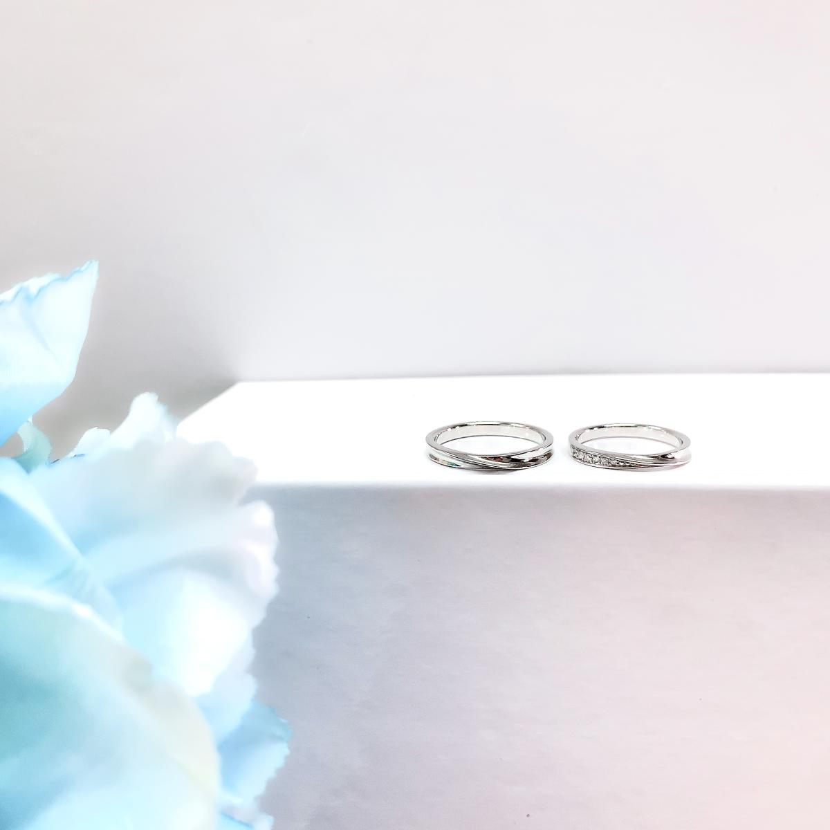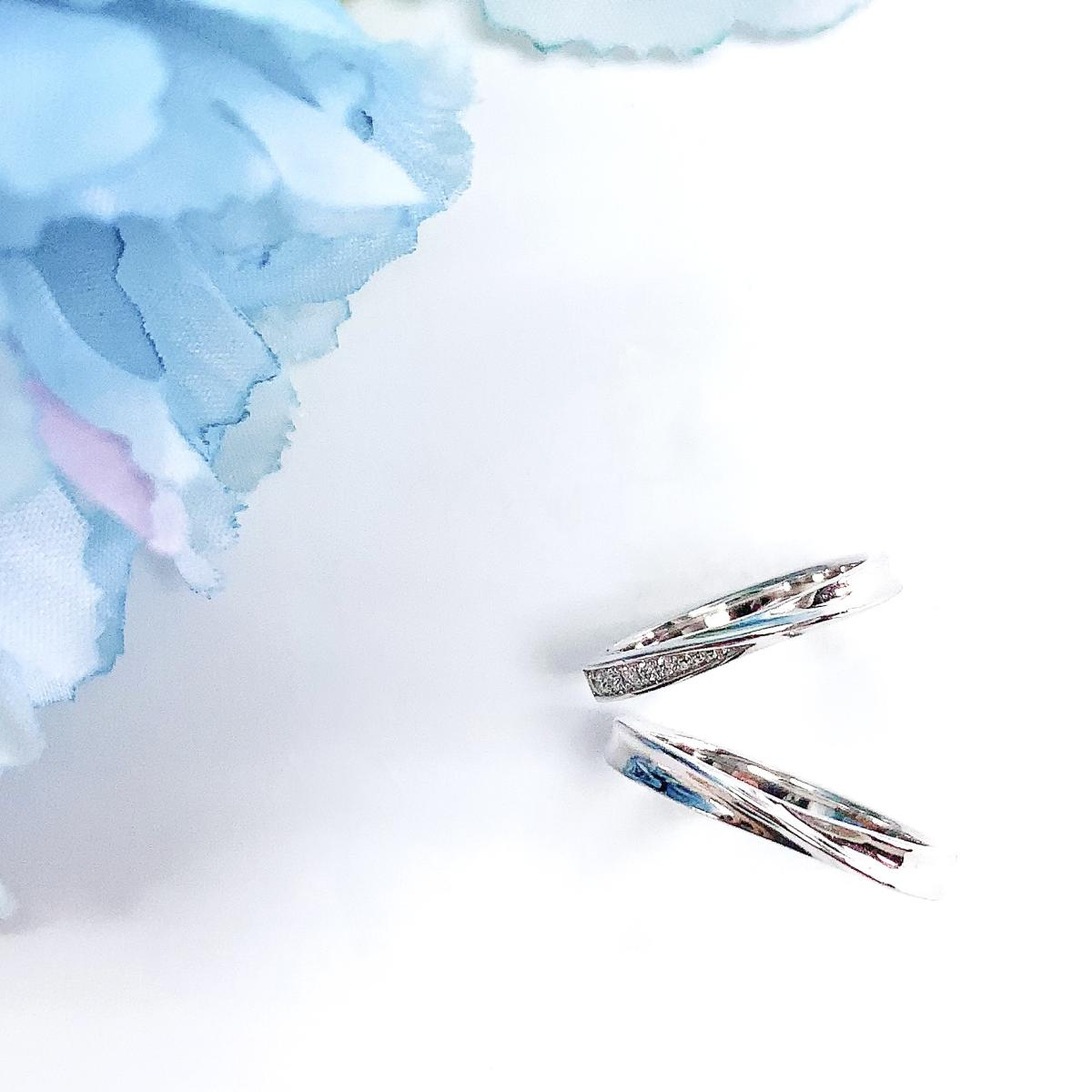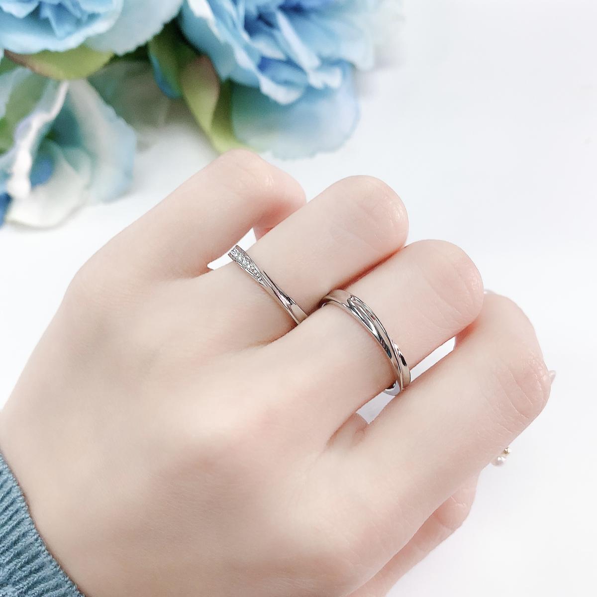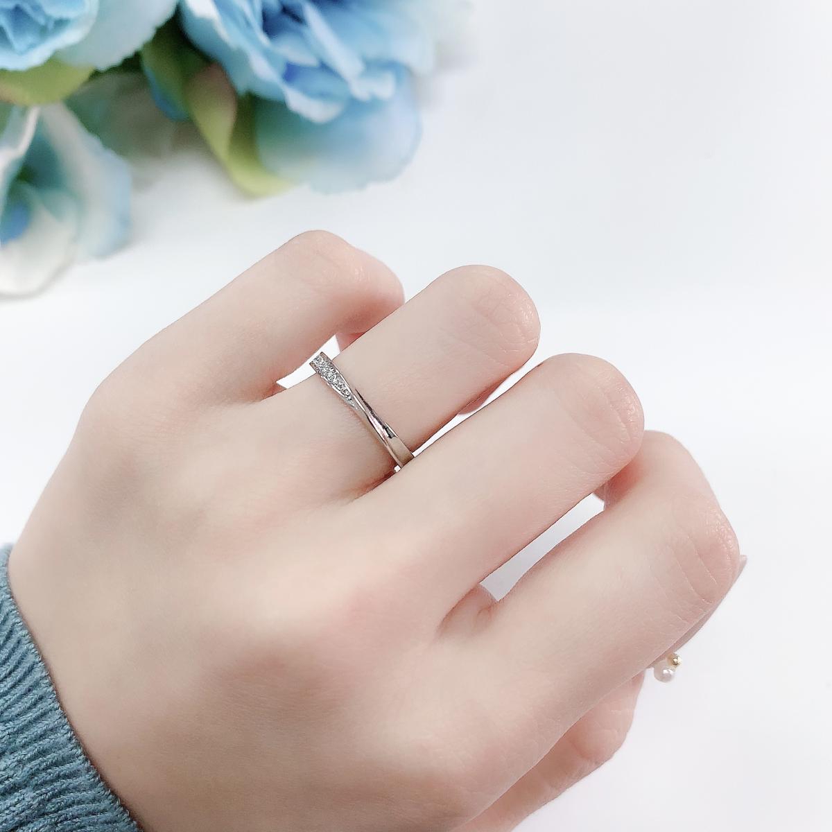 ゆるやかに弧を描くアームが優美な雰囲気。エンゲージリングとの重ねづけなど、コーディネートもしやすいデザインです。リングのフォルムに沿うようにセッティングされたダイヤモンドが可憐な光を放ちます。