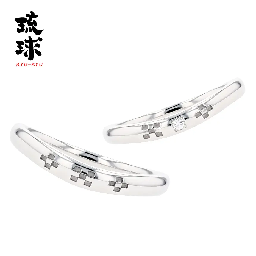 ちゅらは沖縄の方言で「美しい」の意。幸せ感溢れる柔らかで優美なU字ラインを描く結婚指輪。中央カーブラインに合わせてミンサー模様も美しいカーブを描いています。飽きる事がないシンプルなU字ラインのリングには指をほっそりと、長く美しく魅せる効果があります。リング内側を丸く「内甲丸」にして滑らかな着け心地。人生を美しく凛と歩むおふたりをイメージしたリングです。