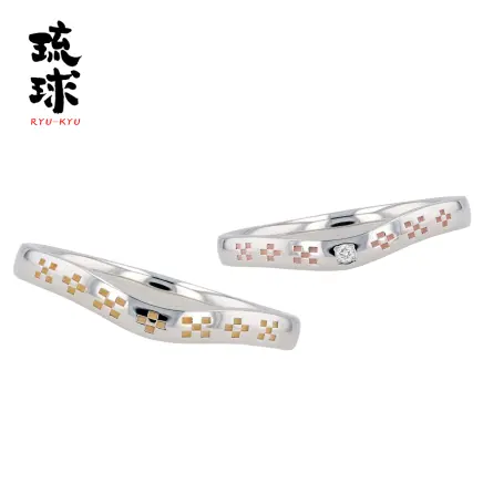 沖縄において結婚披露宴の舞台幕開けには、まず祝儀舞踊曲として「かぎやで風」が披露されます。このかぎやで風に代表される、琉球国王に捧げられた五曲が御前風五節です。ゆったりと気品高く流れる琉球舞踊曲を、結婚指輪「ぐじんふう」の優美で独特なカーブラインで表現しています。リング内側を丸く「内甲丸」にして滑らかな着け心地。沖縄を代表する版画家、「儀間比呂志氏」が山城時計店のために描いて下さった版画絵「御前風」にインスパイアされた結婚指輪となっております。K18YG、K18PGでの制作対応モデルです。